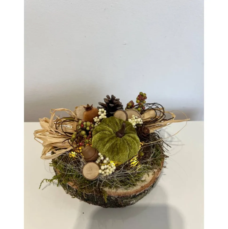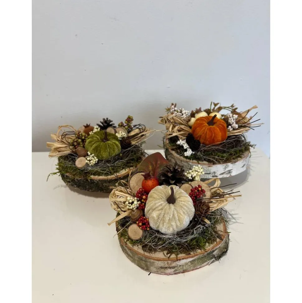 Hier verkaufe ich verschiedene wunderschöne Herbstgestecke auf einer Baumscheibe, die ich mit sehr viel Liebe zum Detail selbst hergestellt habe 🙂
