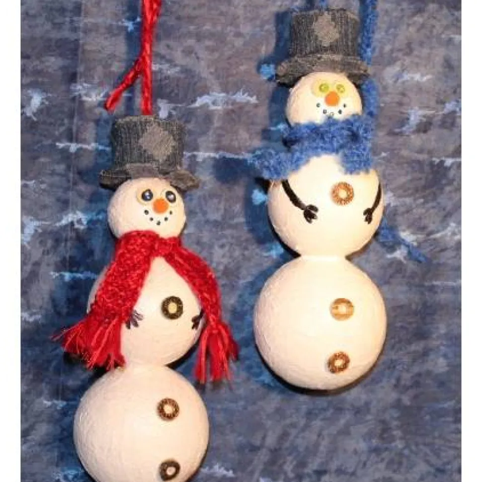 Mit diesen witzigen Unikaten verwandelst Du jede Herbstdeko in ein echtes Highlight. Das Schneemann-Set besteht aus zwei Schneemännern mit je 3 Kunststoffkugeln gestaltet. Die Figuren sind liebevoll mit Papier und handgestrickten Accessoires dekoriert, sowie mit Acrylfarben bemalt. Beide Schneemänner sind mit Glitter, Knöpfen und Wolle dekoriert. Ein Zylinder aus Jeansstoff verziert das Köpfchen.