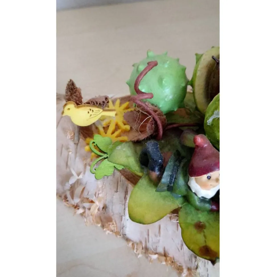 Maße: 32 x 10 cm, Höhe ca. 23cm. Die verwendeten Materialien bestehen aus einer Baumscheibe mit detailreicher Dekofigur.