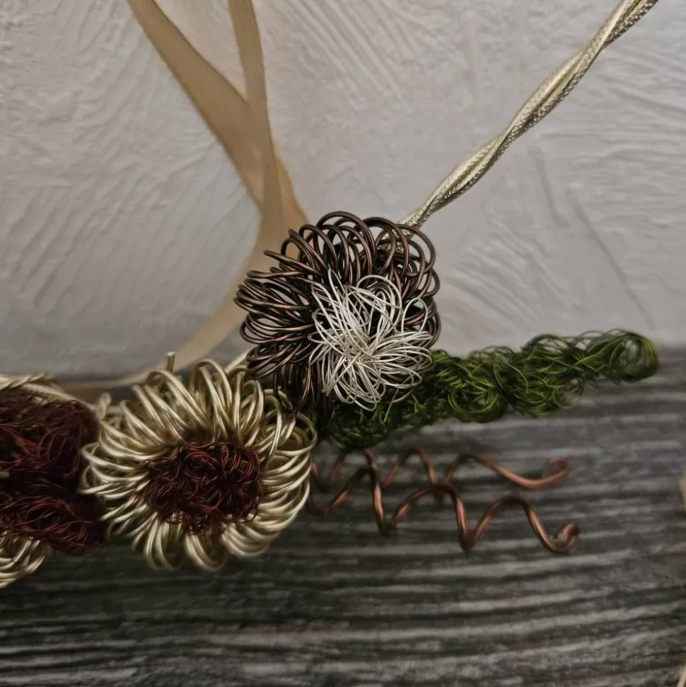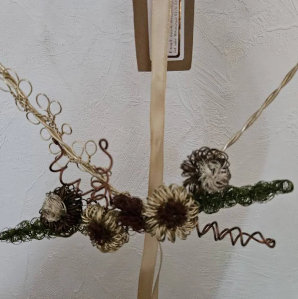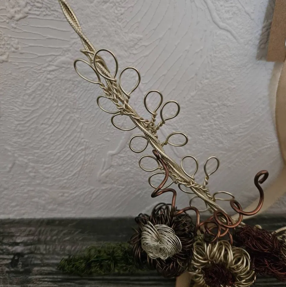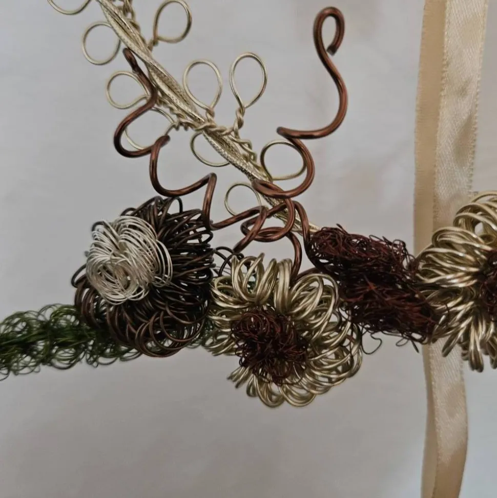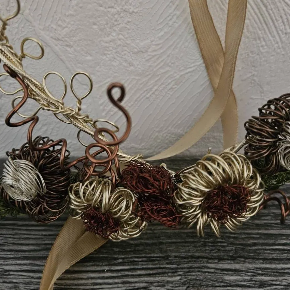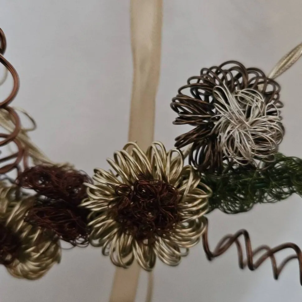 Der Herbst steht vor der Tür. Inspiriert durch die Farben der Natur im Herbst habe ich dieses Herz mit Blumen angefertigt. Das Herz ist aus champagnerfarbenem geprägten Aluminiumdraht. Die Blumen sind aus braunem und champagnerfarbenem glatten Aludraht. Die Grasdolden sind aus olivfarbenem Kupferdraht gefertigt. Alle Teile forme ich per Hand. Zum Aufhängen habe ich ein Satinband ausgesucht. Dieses schöne Stück hat eine Größe von 24 x 24 cm und ist toll als Tür-oder Wanddekoration geeignet. Da der verarbeitete Draht rostfrei ist, kann es auch draussen als Dekoration verwendet werden.