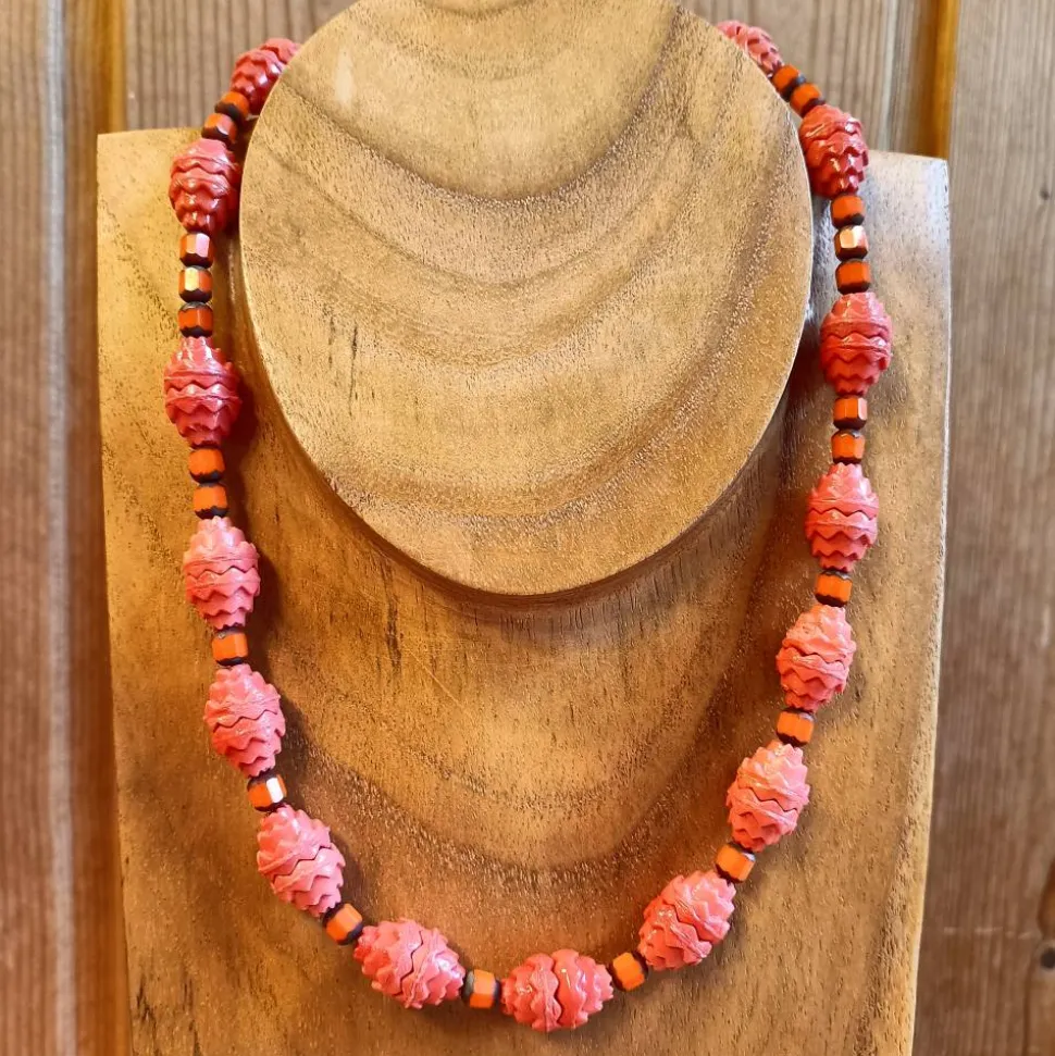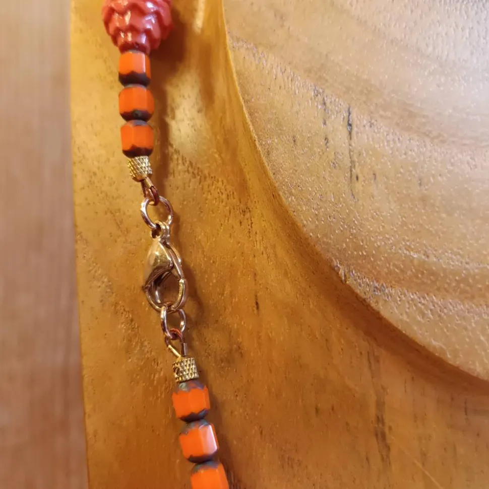 Eine Vintage-Kette aus ganz besonderen orange-farbigen Glasperlen: Je zwei der ungewöhnlichen, alten böhmischen Glasperlen aus den 1920er und 1930er Jahren weisen einen satten opaken Rot-Orange-Ton auf. Mit gezacktem Mustern und gezackten Rändern fügen sich je zwei davon zu einem Lampion von etwa 16 Millimetern Länge. Diese Glasperlen weisen altersbedingte Spuren auf, da sie fast 100 Jahre alt sind, sie wurden aber noch nie getragen, sondern stammen aus wiedergefundenen Lagerbeständen.