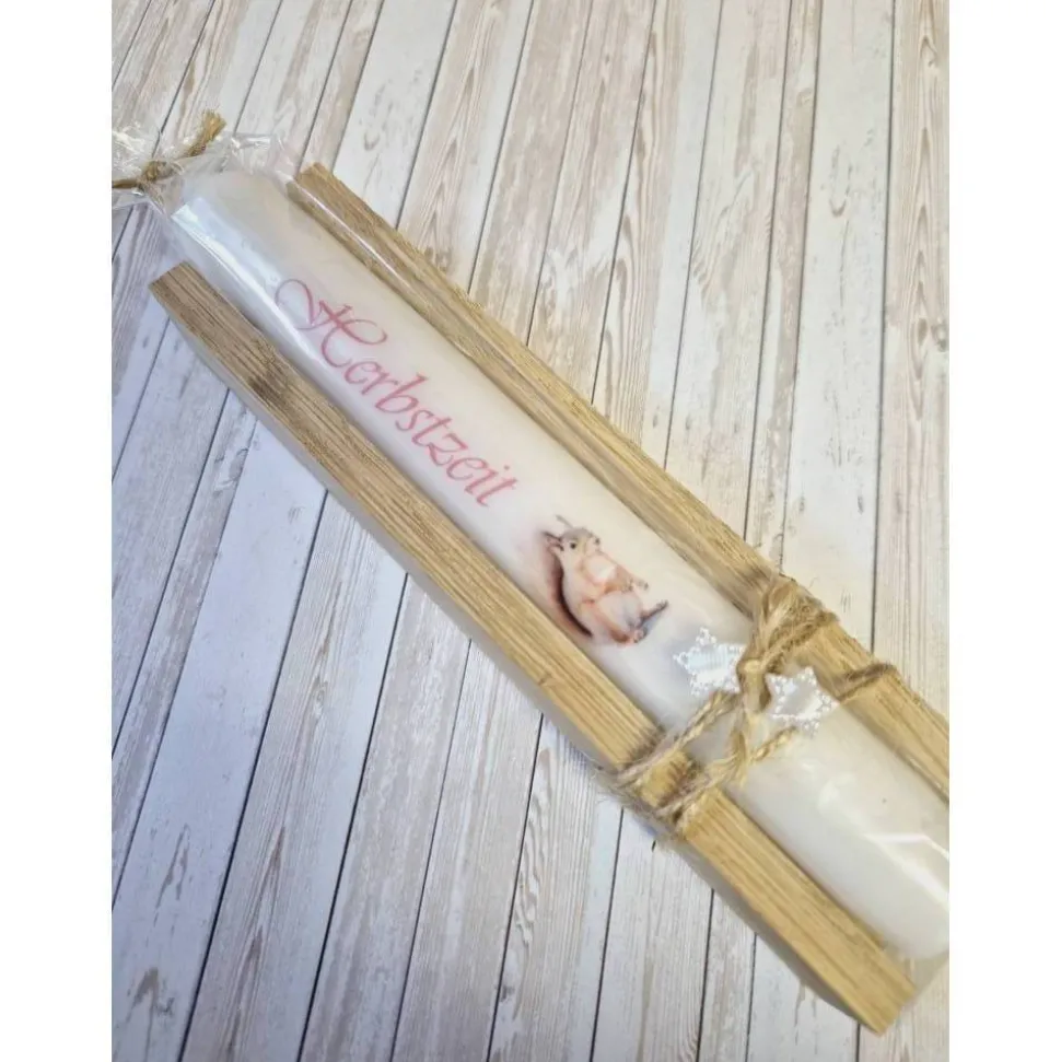 Die hochwertige Stabkerze in weiß misst 18 cm und hat eine Brenndauer von ca. 6 Stunden. Sie ist mit einer besonderen Kerzenfolie mit der Aufschrift „Herbstzeit “ / Eichhörnchen verschönert. Das Set beinhaltet außerdem eine dekorative Holzbox, eine Kordel und weiße Sterne als Verzierung.