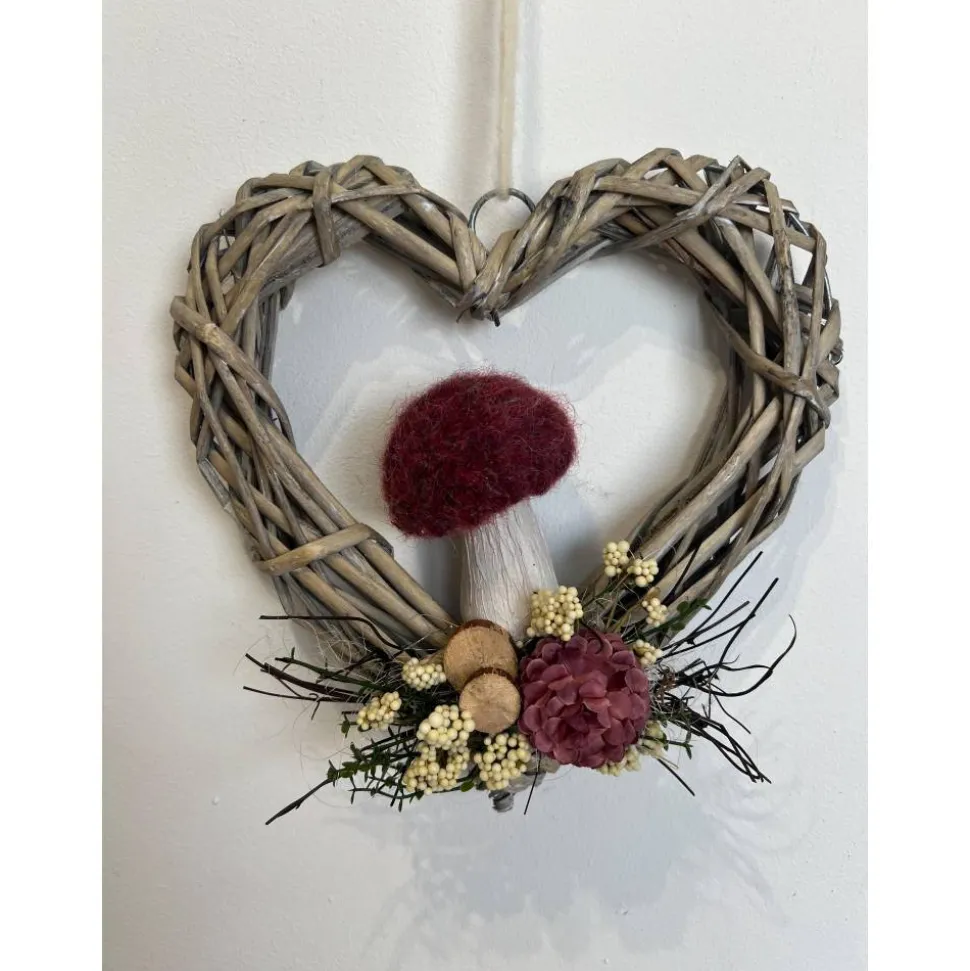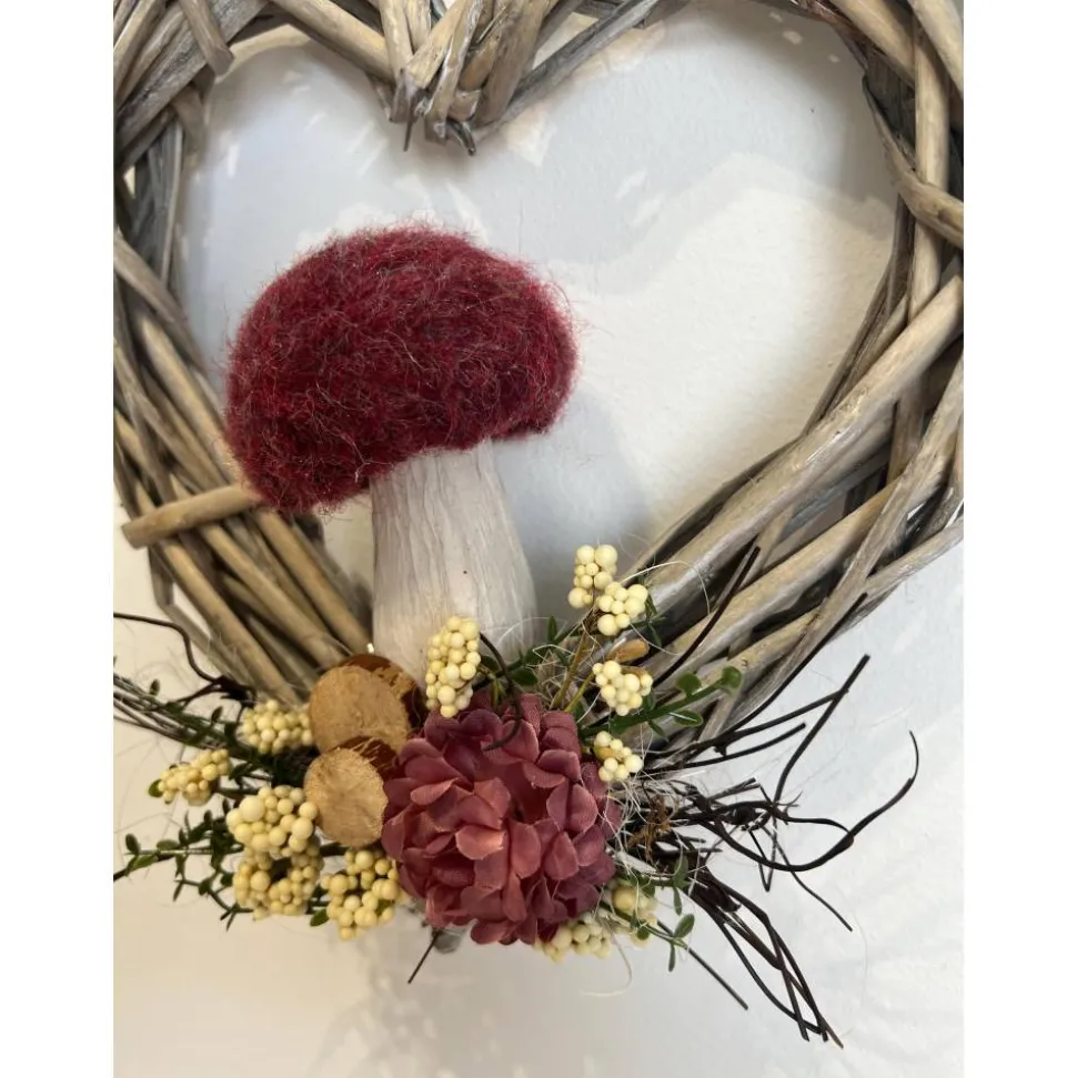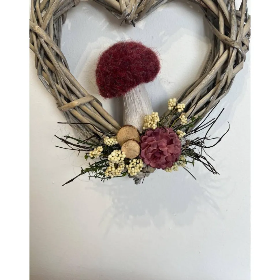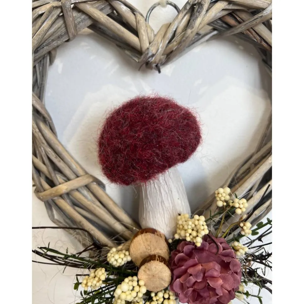 Der schöne Kranz ist mit einem Pilz und verschiedener Herbstdeko verziert und mit ganz viel Liebe zum Detail selbst hergestellt 🙂