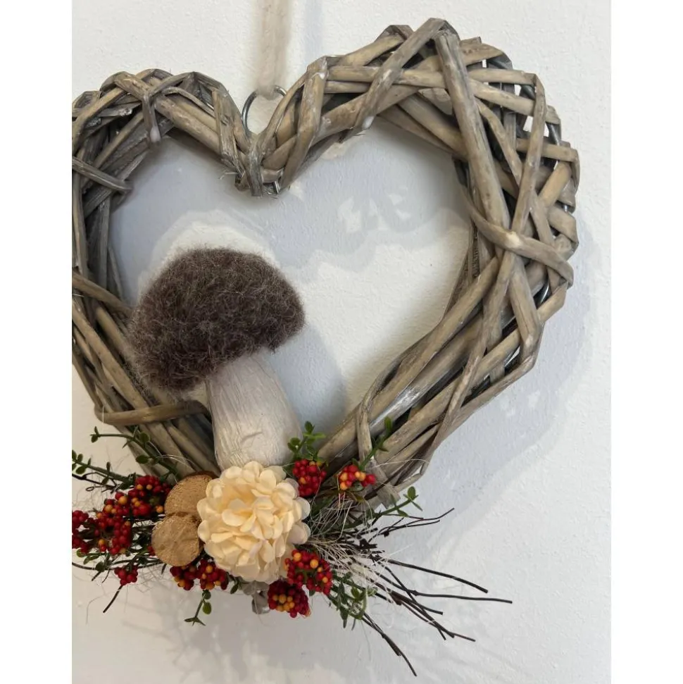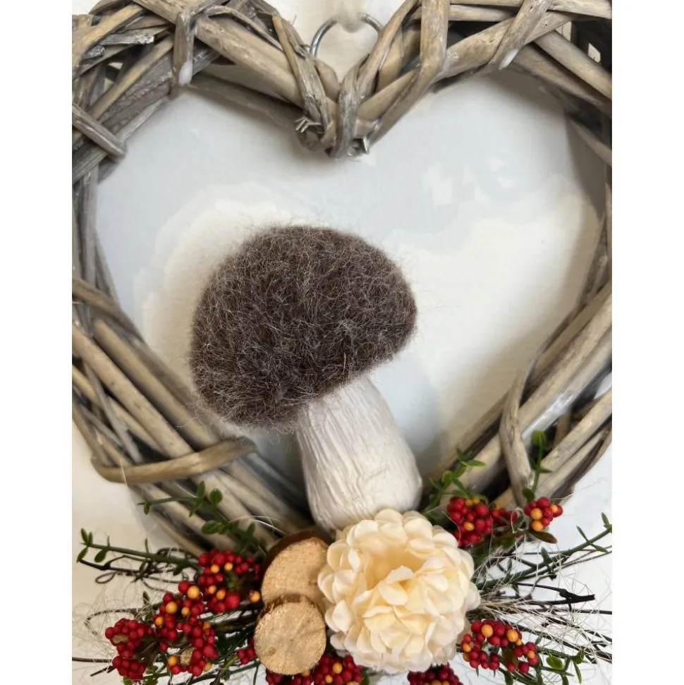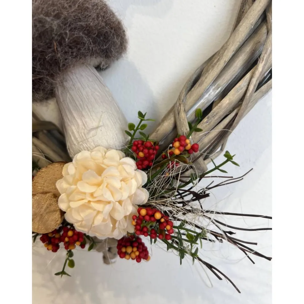 Der schöne Kranz ist mit einem Pilz und verschiedener Herbstdeko verziert und mit ganz viel Liebe zum Detail selbst hergestellt 🙂