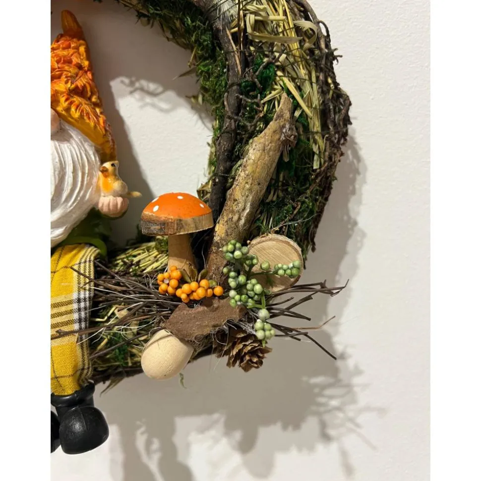 Der schöne Kranz ist mit einem Wichtel und verschiedener Herbstdeko verziert und mit ganz viel Liebe zum Detail selbst hergestellt 🙂