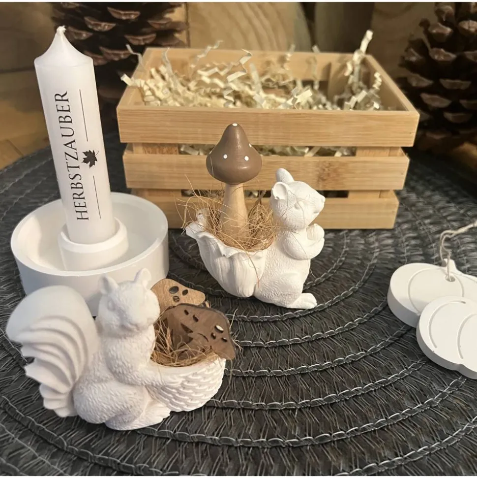 ° Zwei kleine dekorierte Eichhörnchen, detailverliebt gefertigt und ideal als herbstliche Tisch- oder Fensterbankdeko.