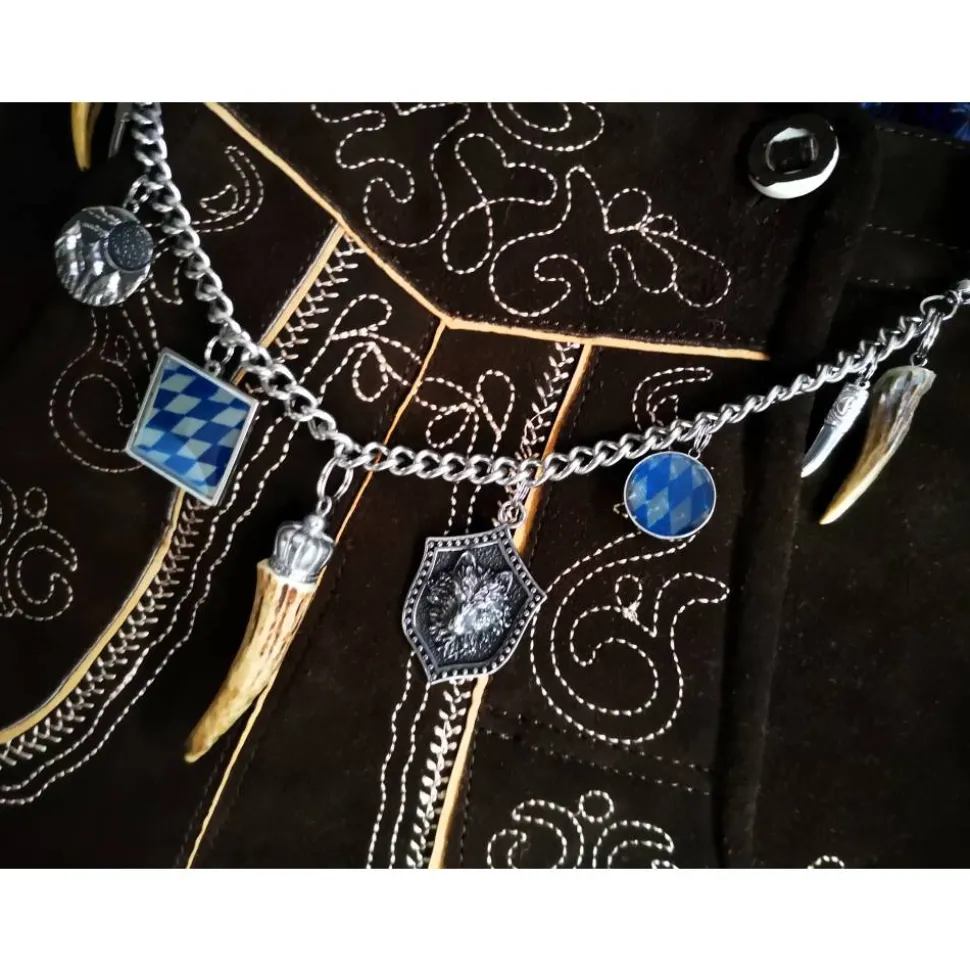 Dieses imposante Charivari ist einmalig gefertigt und lässt sich wunderbar zur Lederhose tragen. Es wird an den Gürtelschlaufen oder an den Hosenträgerknöpfen eingehakt ( hier werden 2 Ringe mitgeliefert).