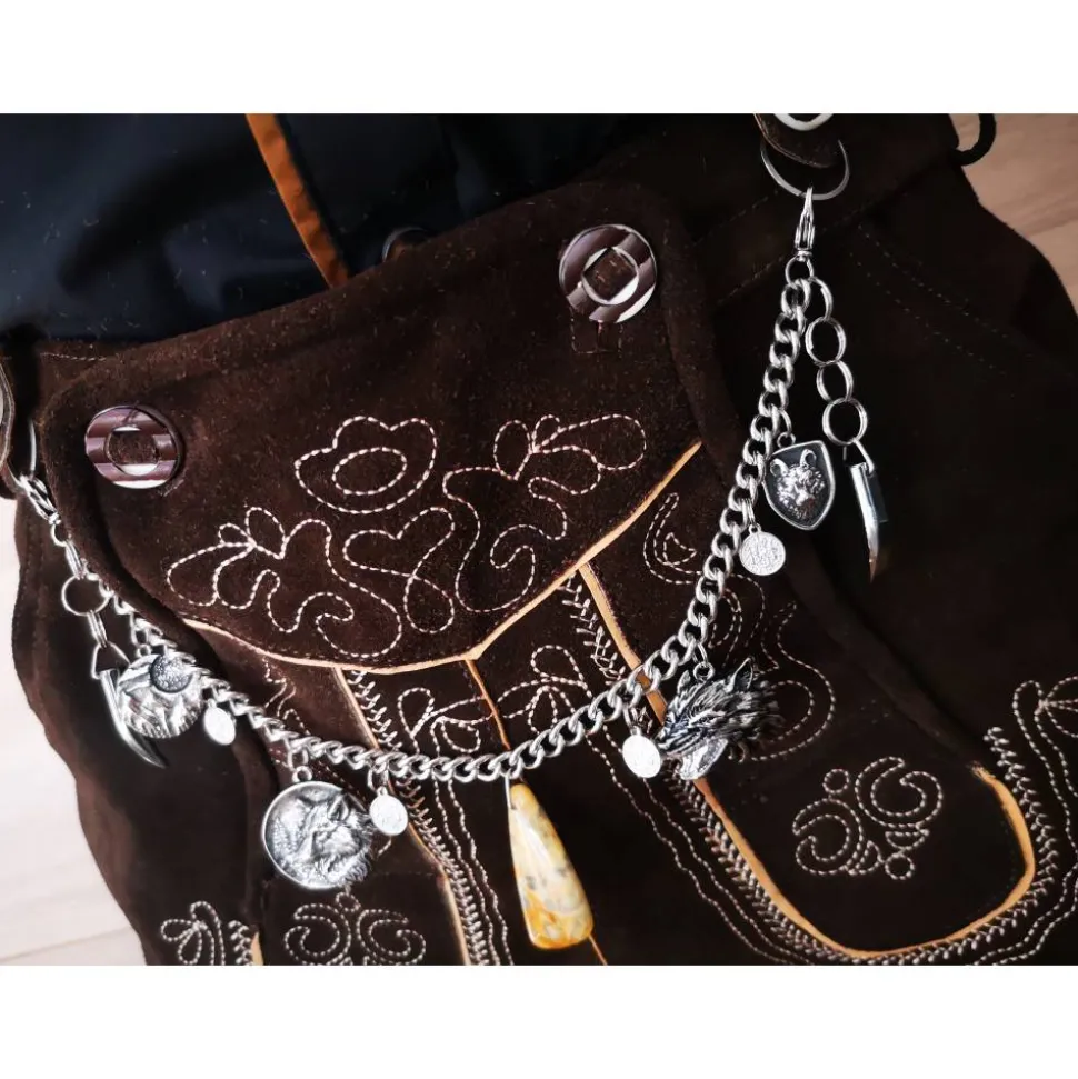 Dieses imposante Charivari ist einmalig gefertigt und lässt sich wunderbar zur Lederhose tragen. Es wird an den Gürtelschlaufen oder an den Hosenträgerknöpfen eingehakt ( hier werden 2 Ringe mitgeliefert).