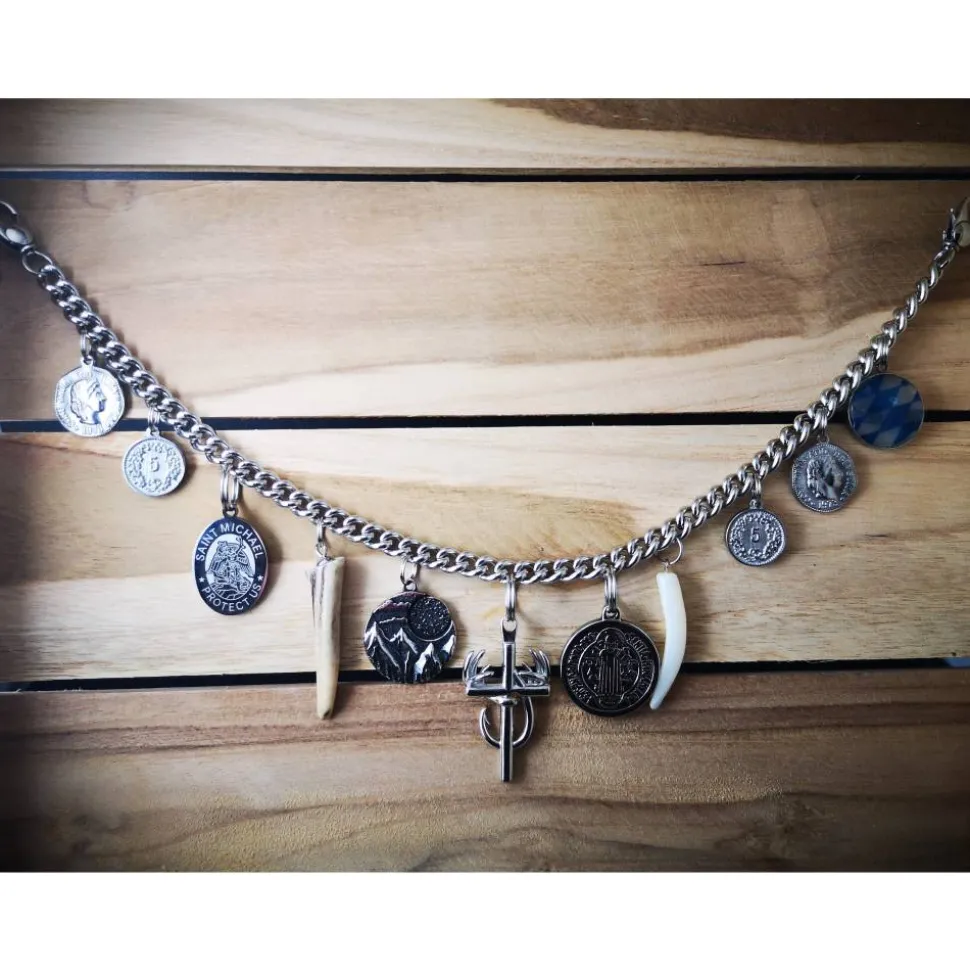 Die kurze Kette hat eine Länge von ca. 34 cm und verfügt über zwei Edelstahldrehkarabiner zur Befestigung an den Gürtelschlaufen. Zusätzlich werden zwei Edelstahlringe mitgeliefert, um das Charivari an den Hosenträgerknöpfen zu befestigen.