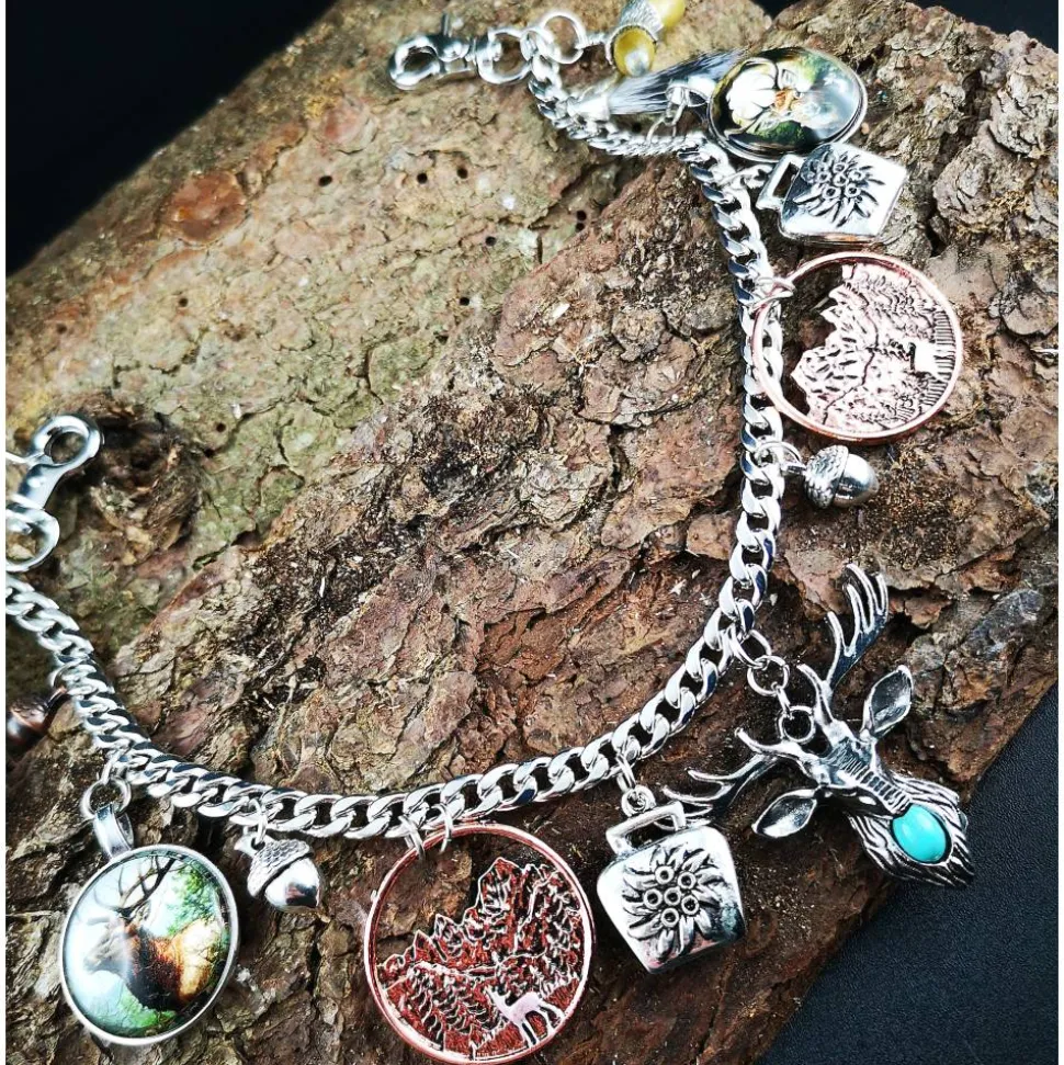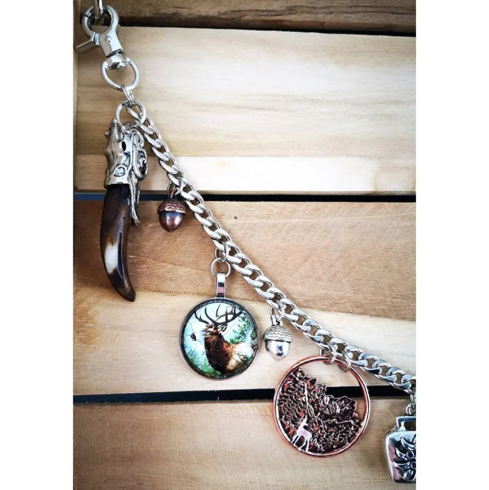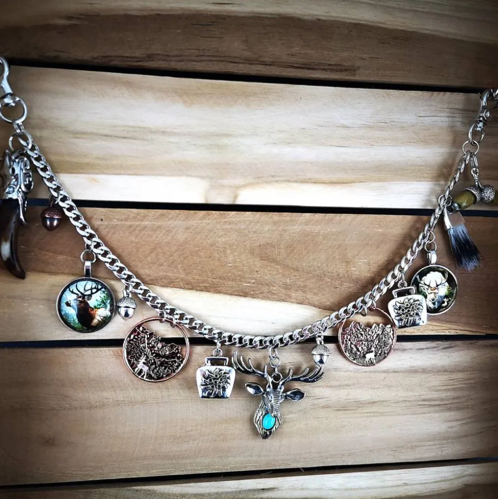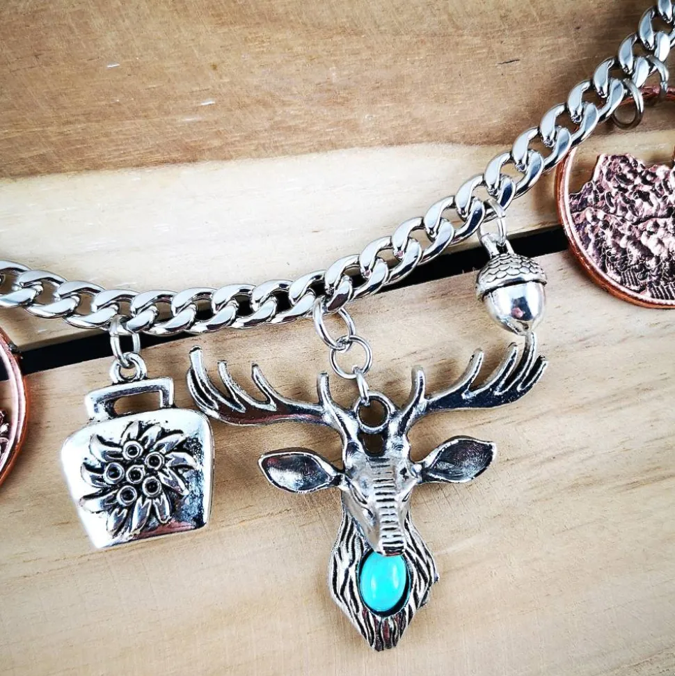 Die Hirschmotive, der verzierte Zahn aus Harz und Metall und die Eicheln aus Metall, Holz und Harz ergänzen das Gesamtbild des mehrfarbigen Charivari perfekt.