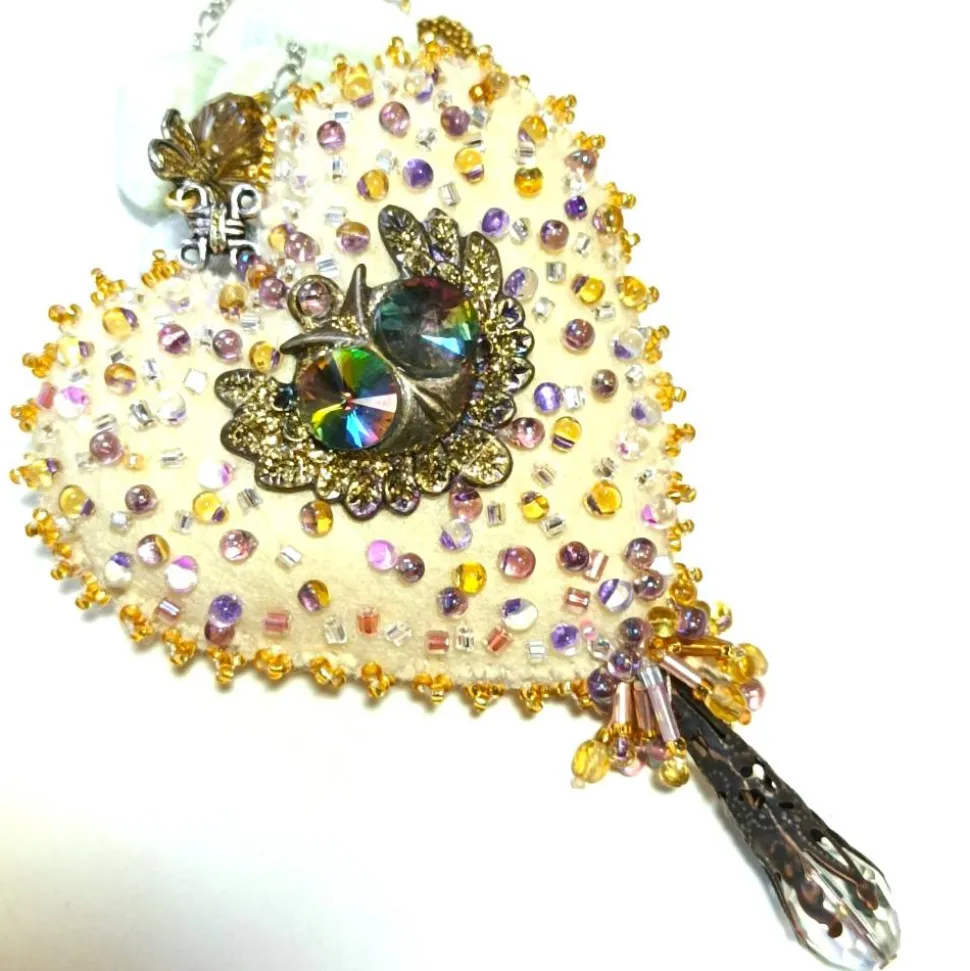 Herz mit Eule und facettiertem Tropfen auf creme beige silber: ca. 8 cm x 8 cm, ca. 2 cm hoch, Gesamtlänge mit Kettchen ca. 27 cm Besonders hübsch ist der konturierte liebevoll handgestickte Rand aus kleinen Perlchen, der wirkt wie eine funkelnde Zackenlitze.Die mit Schmetterling verzierte Kette zum Aufhängen verlieiht diesem Herz Ornament einen spielerischen Charme.
