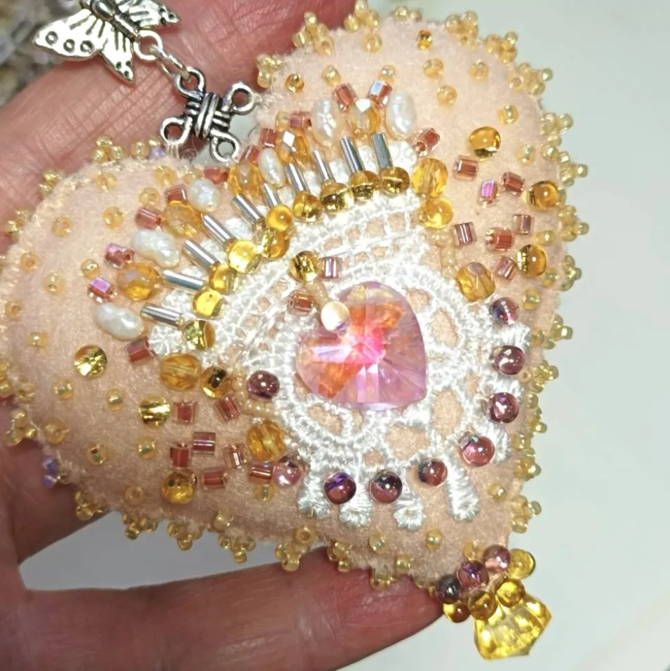 Die Rückseite des gepolsterten Herzen ist individuell mit Perlen um ein Glasherz gestaltet. So wird jedes Ornament zum dekorativen Highlight – ideal für Blumensträuße, Geburtstagen, Hochzeiten, Muttertag oder als Tischdeko zur Verlobung.