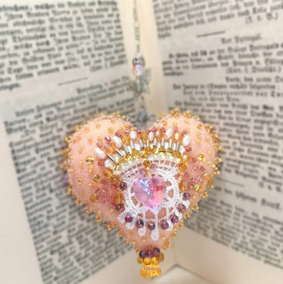 Edel wirkt diese romantische Wohndeko handbestickt mit Barockperlen: Nicht nur für Romantiker ist dieses Ornament mit Schlüssel ein schönes Geschenk mit Herz. Der Schlüssel ist ein Symbol für den Zugang zu etwas wertvollem wie deinem Herzen. Er öffnet Türen zu neuen Möglichkeiten. In feröstlichen Kulturen ist der Schlüssel ein Glücksbringer.. Dieses kleine handbestickte Herz Ornament als Unikat begeistert mit dem verspielten Schlüssel umspielt von Barockperlen in schimmerndem creme auf dem sanftem apricot lachs Farbton. Auf der anderen Seite umspielen die Perlen ein Kristallherz in rosa als Symbol für die Liebe. Jedes Herz ist ein handgemachtes Einzelstück aus Deutschland und verleiht deinem Zuhause mit kunstvoller Perlenstickerei einen Hauch von Exklusivität.