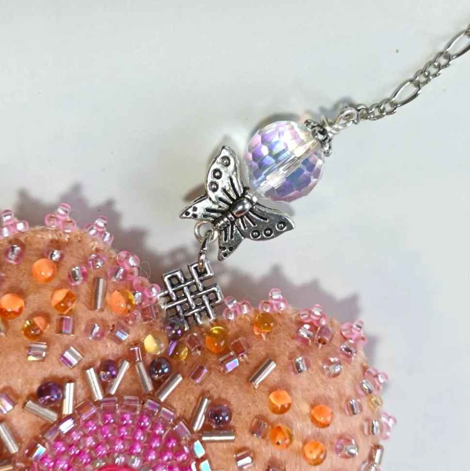 Erlebe romantische Wohndeko in Vollendung: Dieses kleine handbestickte Herz Ornament als Unikat begeistert mit Perlen in leuchtendem pink und pastell rosa auf dem sanftem apricot lachs Farbton. Jedes Herz ist ein handgemachtes Einzelstück aus Deutschland und verleiht deinem Zuhause mit kunstvoller Perlenstickerei einen Hauch von Exklusivität.