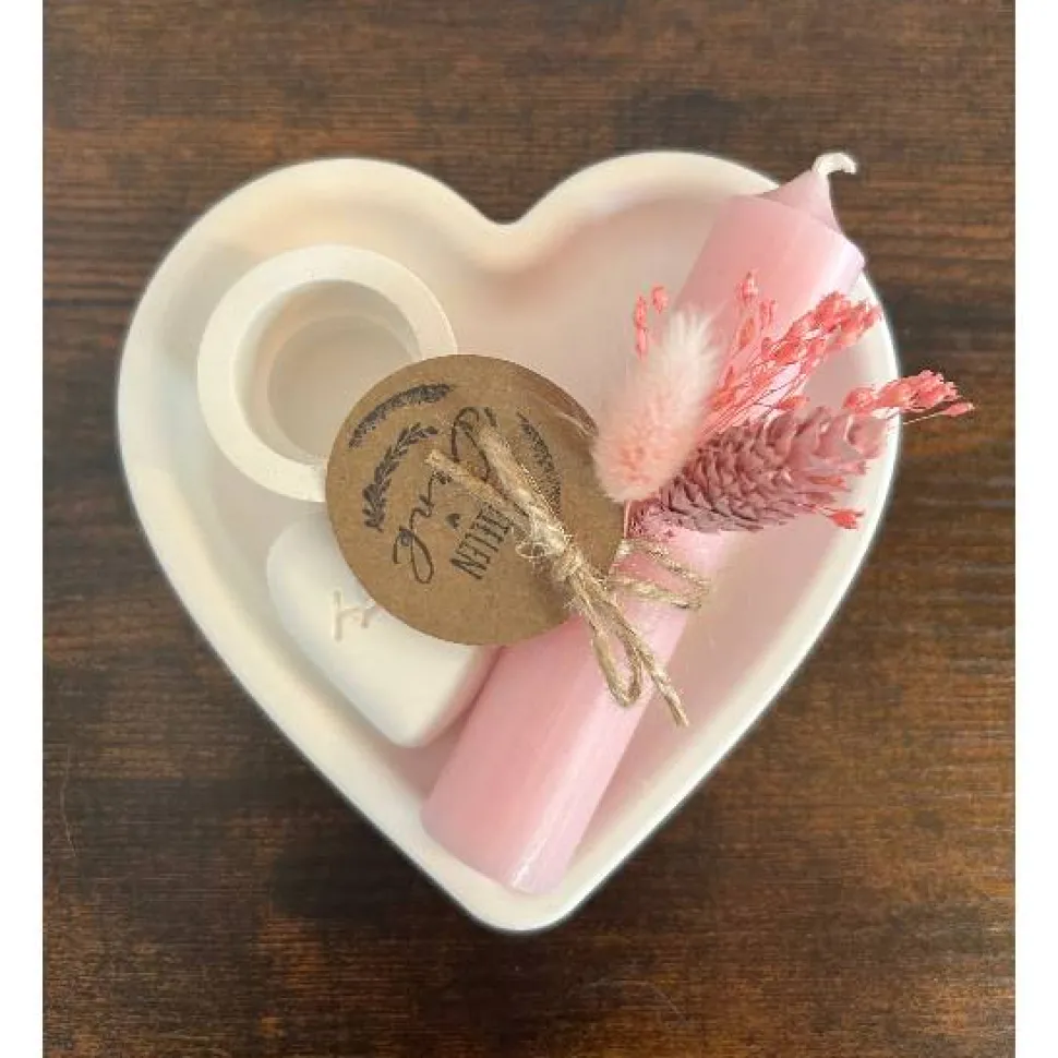 Herz Kerzenständer aus Gießkeramik mit Stabkerze & Trockenblumen – Handgemachtes Geschenk mit Herz