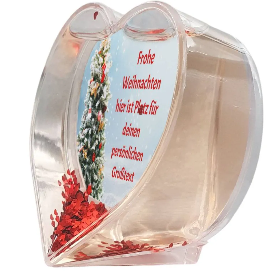 Diese tolle Schneekugel in Herz-Form wird personalisiert mit Ihrem ganz persönlichen Wunschtext zu Weihnachten.