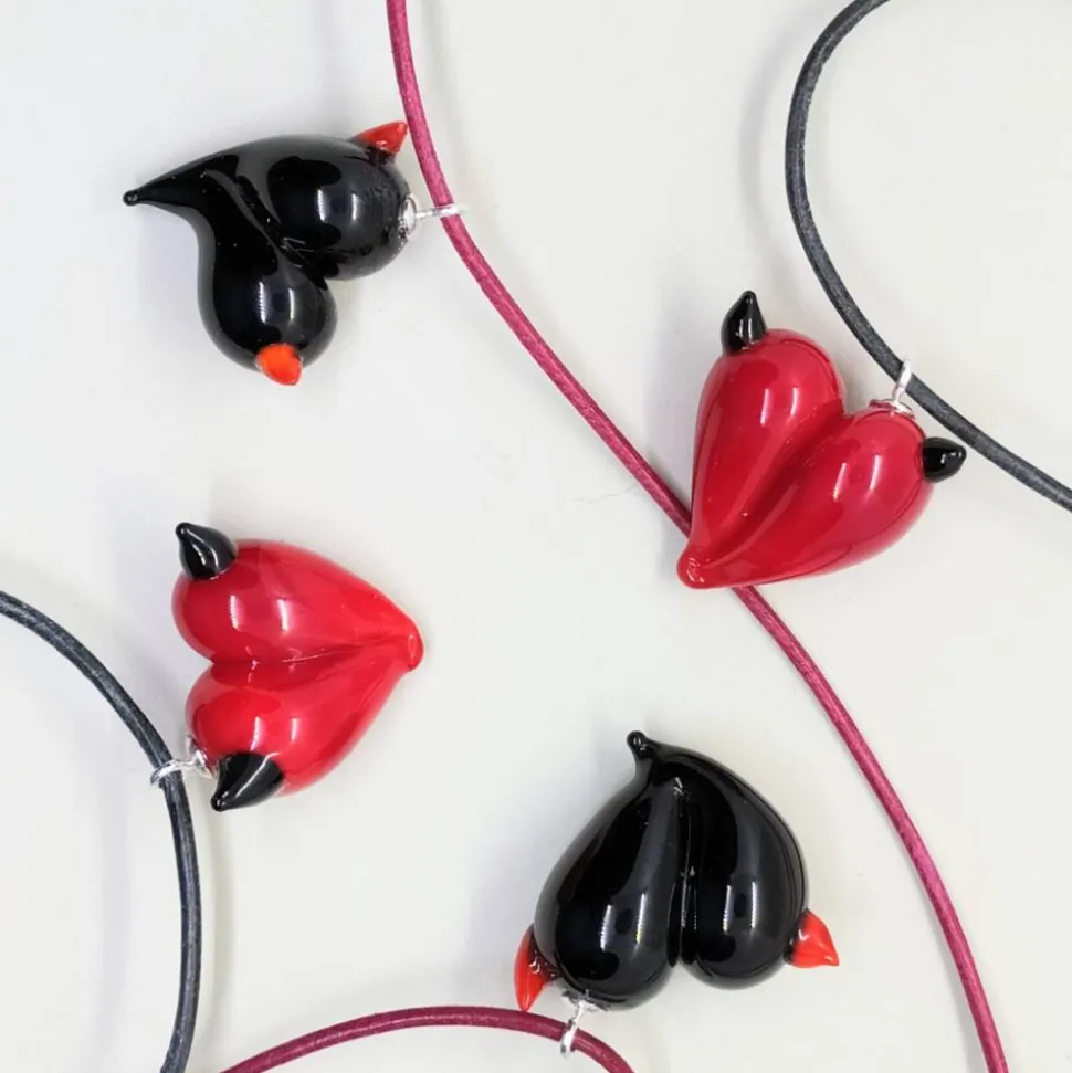 Jedes der handgemachten Herzen aus Glas mit Sterlingsilberösen gibt es am offenen Lederband (mit Anleitung für einen Schiebeknoten).