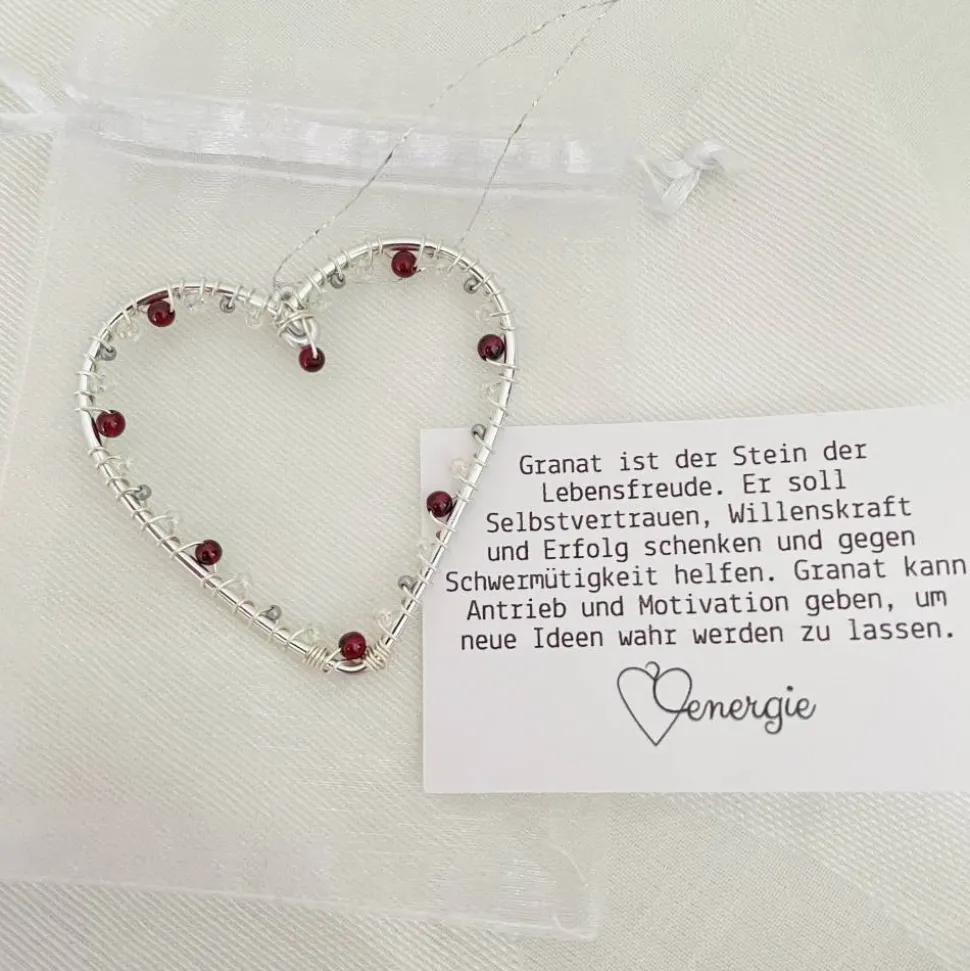 Der kleine Herz Anhänger mit Granat-Perlen eignet sich perfekt, wenn man eine Kleinigkeit schenken will, oder man kann es mit einem Geldgeschenk kombinieren. Als Deko zu Hause sehen die Herzen hängend an Ästen oder ganz klassisch auf dem Weihnachtsbaum schön aus. Man kann sie auch als Glücksbringer z.B. neben dem Bett oder im Büro aufhängen, wo es die Gedanken unbewusst auf die schönen Wirkungen des Steins lenkt. Der Herzanhänger schenkt langfristig Schönheit und Achtsamkeit in den Alltag und bringt das Zuhause zum Strahlen.