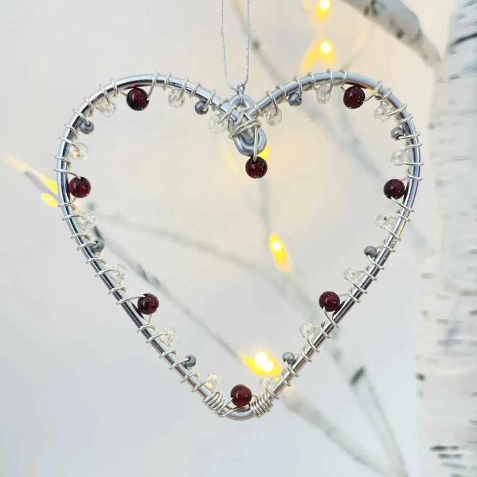 Dieser Fensterschmuck wird liebevoll als Handarbeit gefertigt. Jedes Herz wird sorgfältig aus rostfreien Aluminium Draht geformt und mit glänzenden Glasperlen und Energie spendenden Heilsteinen dekoriert. Jeder Fensterschmuck ist ein Unikat mit 8 Heilsteinen und einer Größe von ungefähr 6 x 6 cm.