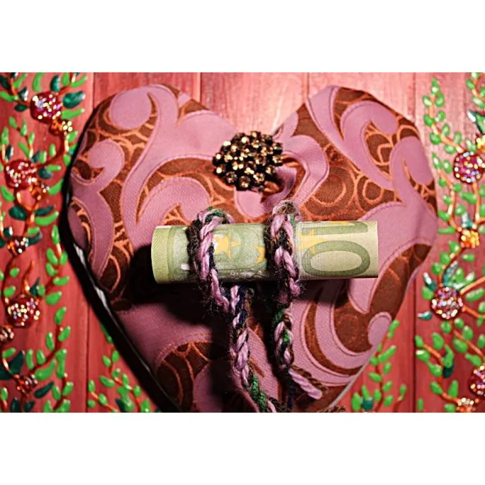 In der Mitte des Herzerls ist eine gehäkelte Schleife angenäht. Hier kann ein Geldschein oder kleiner Gutschein platziert werden (siehe Detailfoto).
