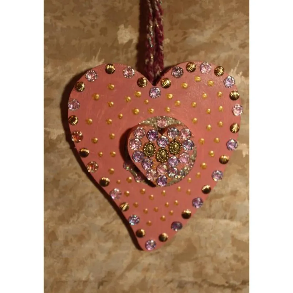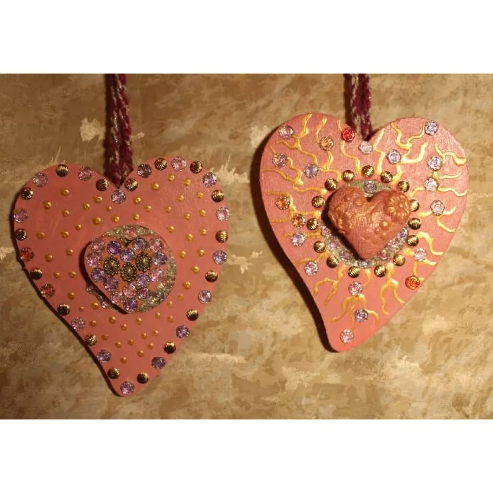 Die Herzen bestehen aus Holz, dekoriert mit unzähligen Schmucksteinen aus Kunststoff.und Metall.