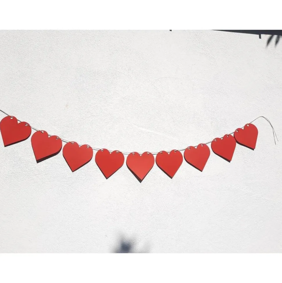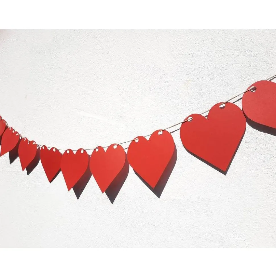 Die einzelnen Herzen sind 13,5 x 13,5 cm groß. Es sind 9 Herzen enthalten, die Girlande ist somit etwa 1,30m lang.