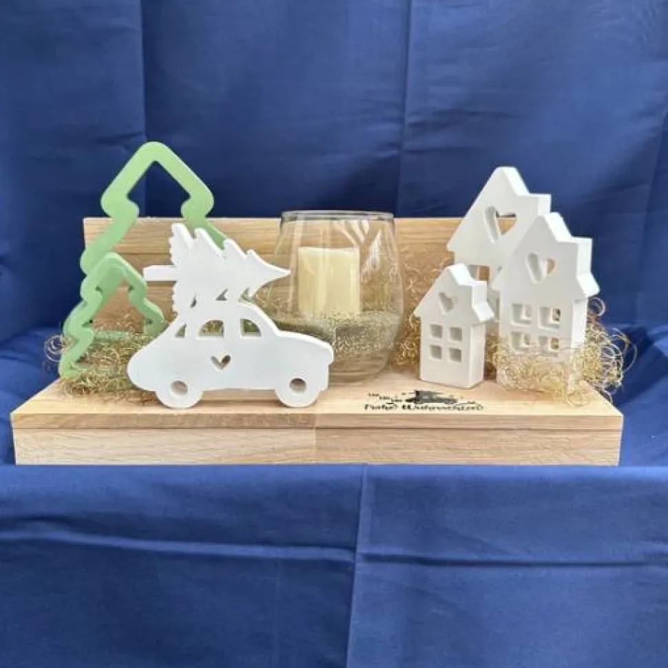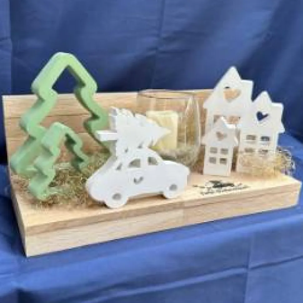 Dieses handgemachte Deko-Arrangement auf einem Holzbrett bringt festliche Stimmung in dein Zuhause: