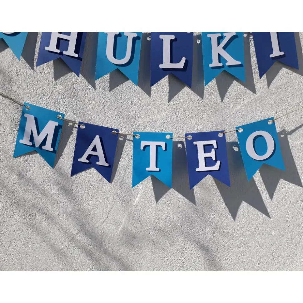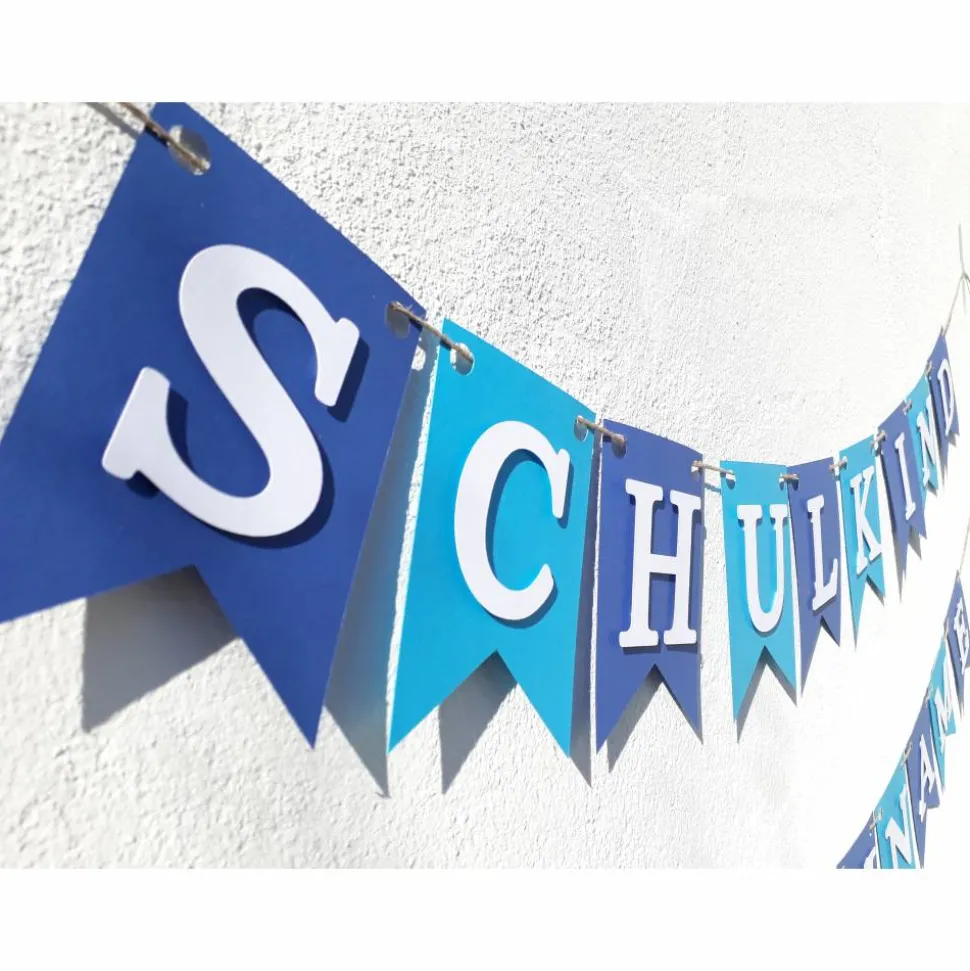 Mit unserer individuell personalisierbaren Girlande zum Schulanfang bekommen Sie die passende Dekoration für diesen spannenden Tag. Die einzelnen Wimpel sind in Mittelbau und Dunkelblau gehalten mit klarer weißer Schrift die durch eine spezielle Klebetechnik einen besonderen 3D Effekt bekommt. Die Elemente sind 13,5 cm hoch und 9,5 cm breit, somit ergibt sich für die Grundgirlande eine angenehme Länge von etwa 1,20.