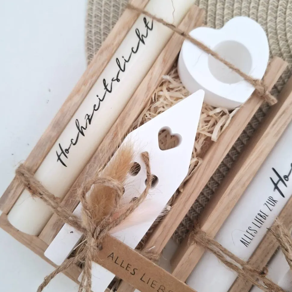 Das Kerzenset besteht aus einer Kerze (in der Farbe deiner Wahl) mit einer Aufschrift deiner Wahl, einem passenden Kerzenhalter in Herzform und einem Haus / Lichthaus.