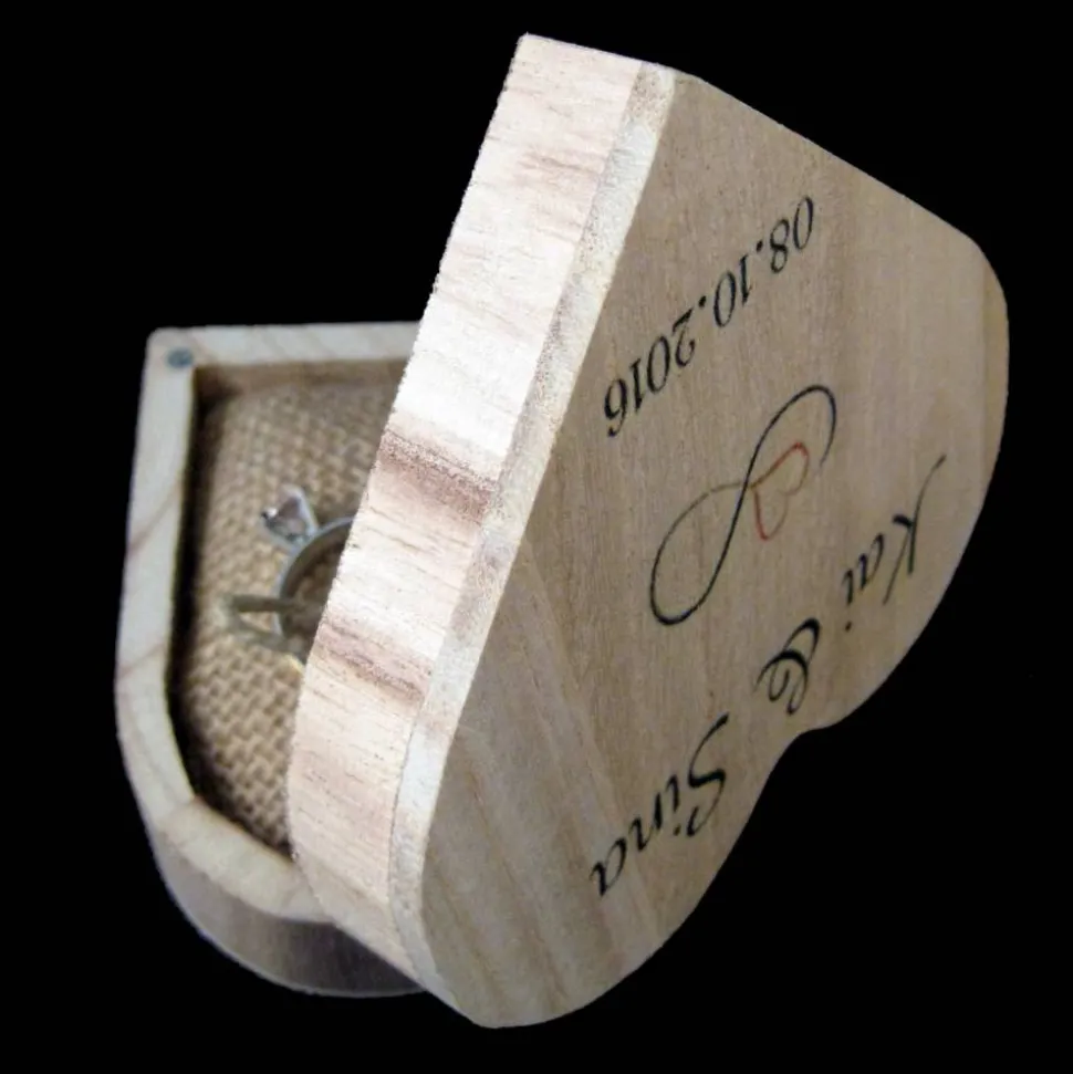 Die Ringen können einfach an den praktischen Satin- oder Jutebändern festgebunden werden. Die Vornamen und das Hochzeitsdatum werden nach Wünsch -wie auf den Bilder- stilvoll auf dem Holzbox aufgebracht.