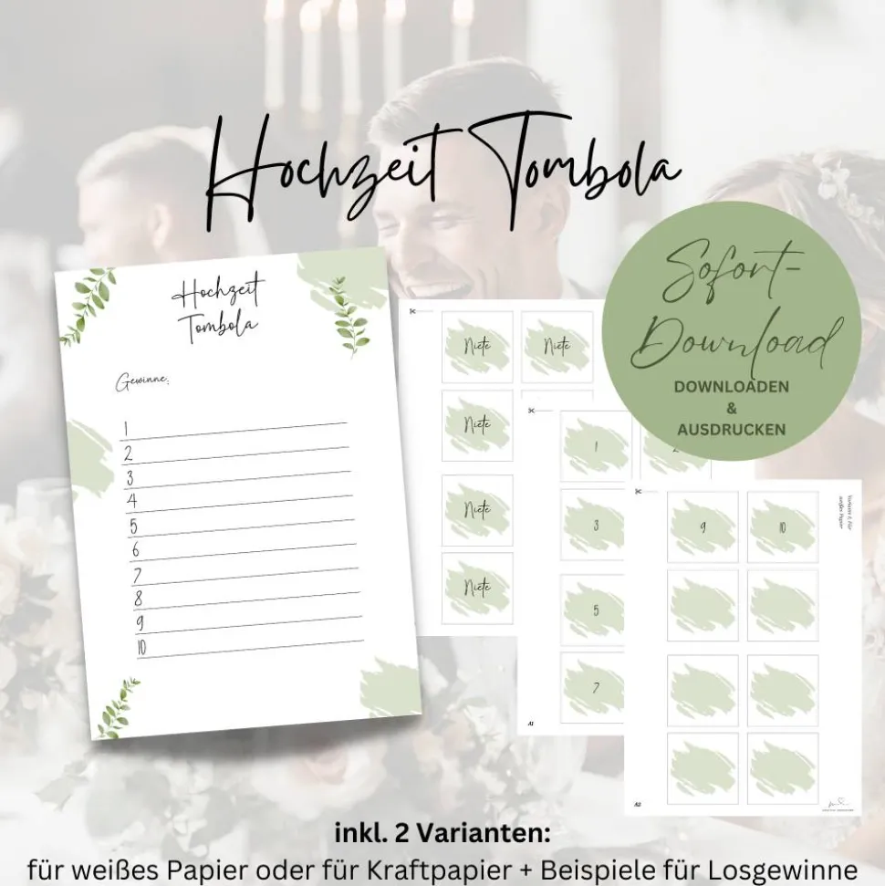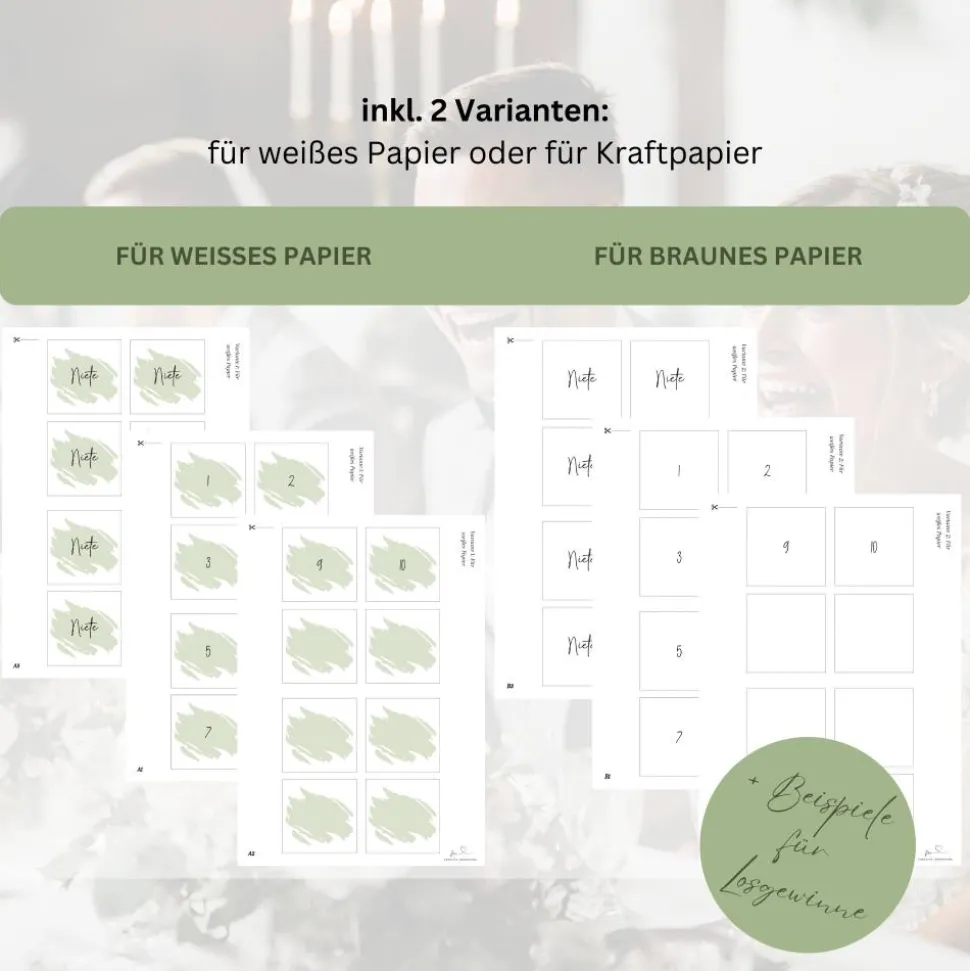 Die Lose habe ich in zwei Varianten erstellt, somit kannst du entscheiden, ob du die Lose auf weißem oder ggf. auch auf Kraftpapier drucken möchtest. Du kannst die Lose so oft ausdrucken, wie du sie benötigst.