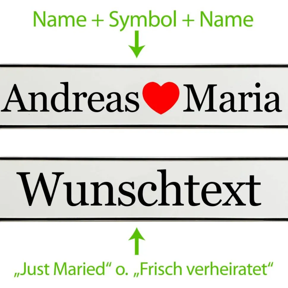 Du gibst einfach die gewünschten Namen an und wählst die passende Schriftart – wir fertigen dein persönliches Hochzeitskennzeichen mit viel Liebe zum Detail. Schon in kurzer Zeit hältst du deine individuelle Autodeko in den Händen.