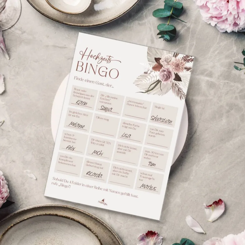 ⭐ GUTE STIMMUNG: Eure Gäste kennen sich nicht alle untereinander? Dann ist das Hochzeitsbingo Spiel super, damit sich die Stimmung auflockert und die Gäste sich kennen lernen.