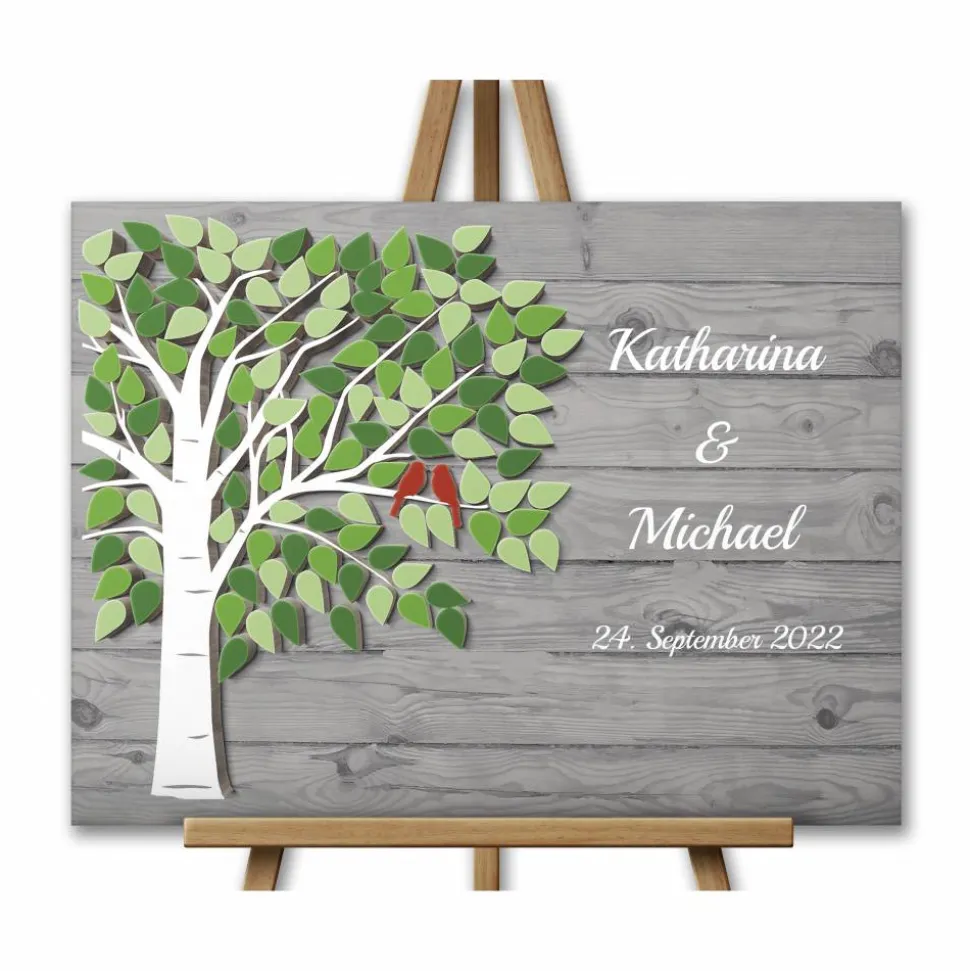 Halte die wertvollsten Erinnerungen an Deinen großen Tag fest mit einem Hochzeitsgästebuch auf Leinwand. Der detailreich gestaltete Hochzeitsbaum wird von Deinen Gästen mit Fingerabdrücken und Unterschriften zum Leben erweckt. So entsteht ein einzigartiges Kunstwerk, das Liebe und Gemeinschaft symbolisiert.