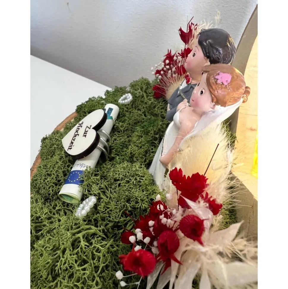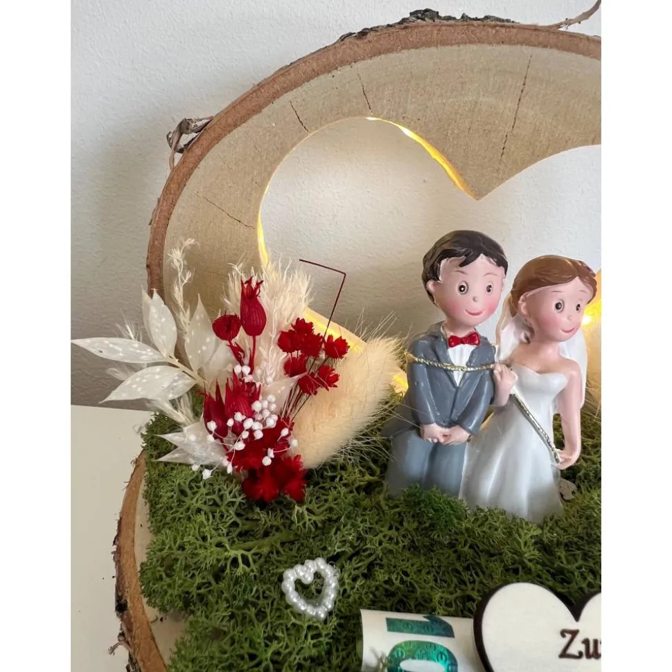 Ein schönes Hochzeitsgeschenk auf einer Baumscheibe mit einem tollen LED Herz, dass man als Geldgeschenk verschenken kann und danach als Erinnerung aufstellen kann 🙂