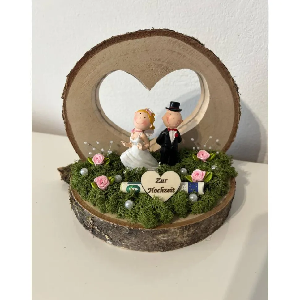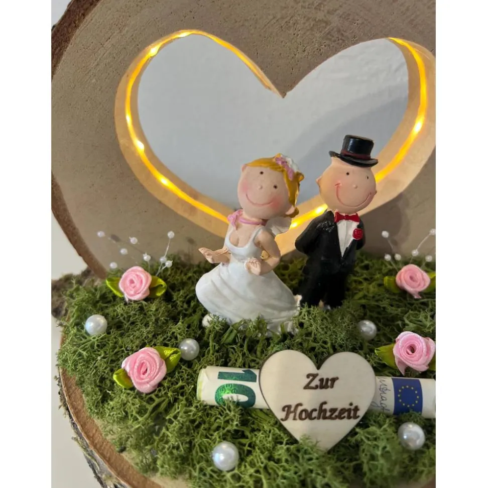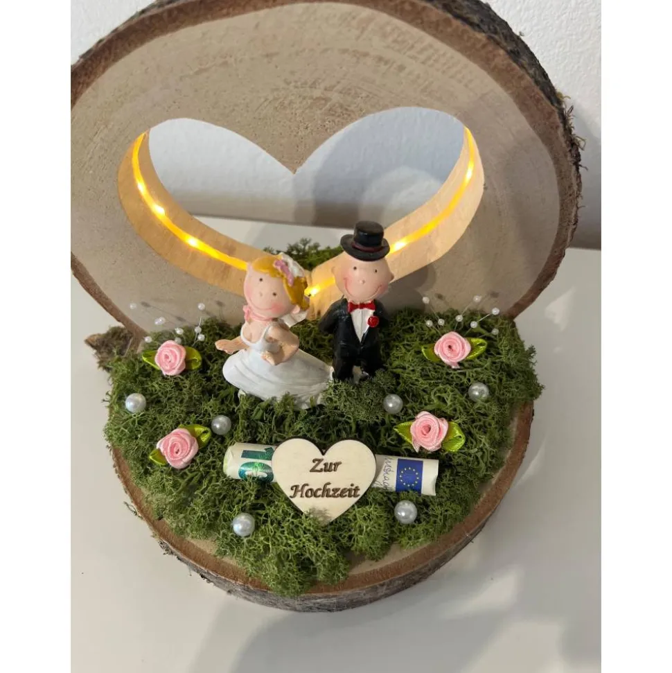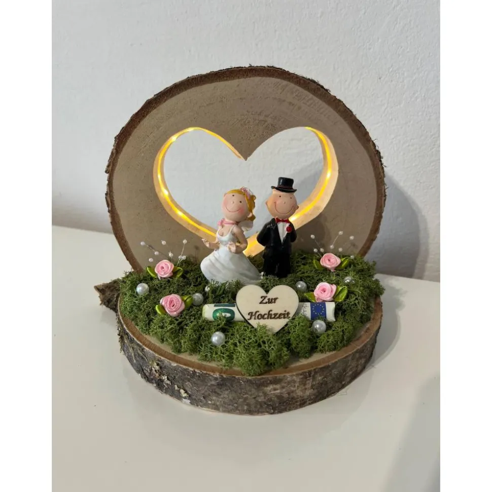 Ein schönes Hochzeitsgeschenk auf einer Baumscheibe mit einem tollen LED Herz, dass man als Geldgeschenk verschenken kann und danach als Erinnerung aufstellen kann 🙂