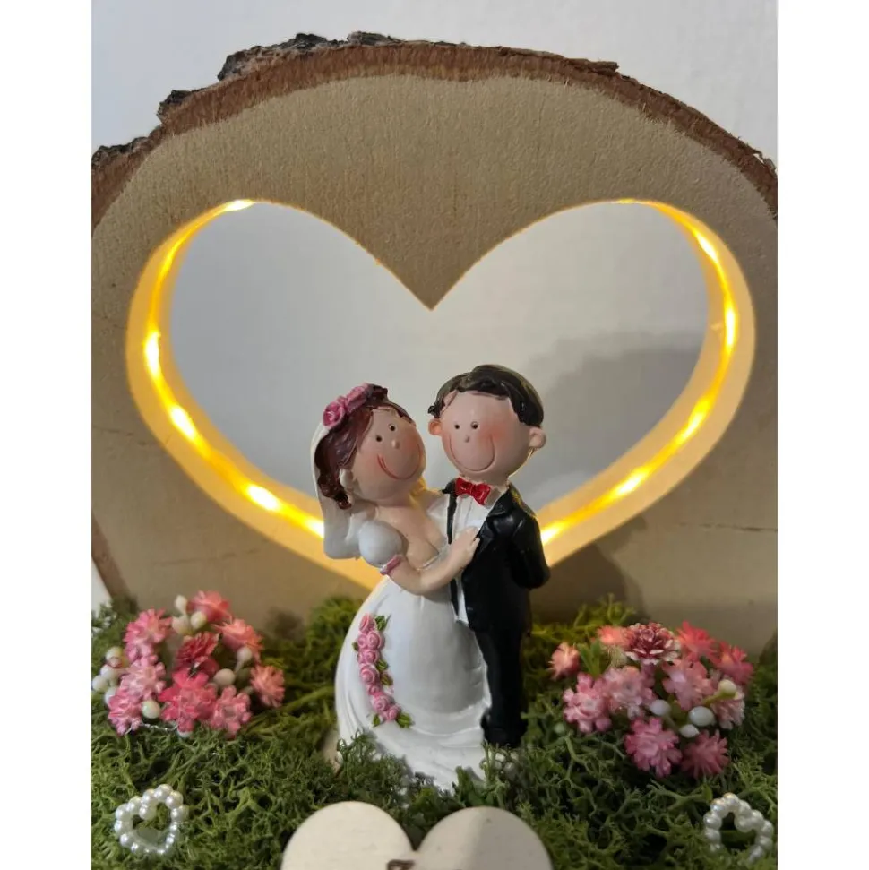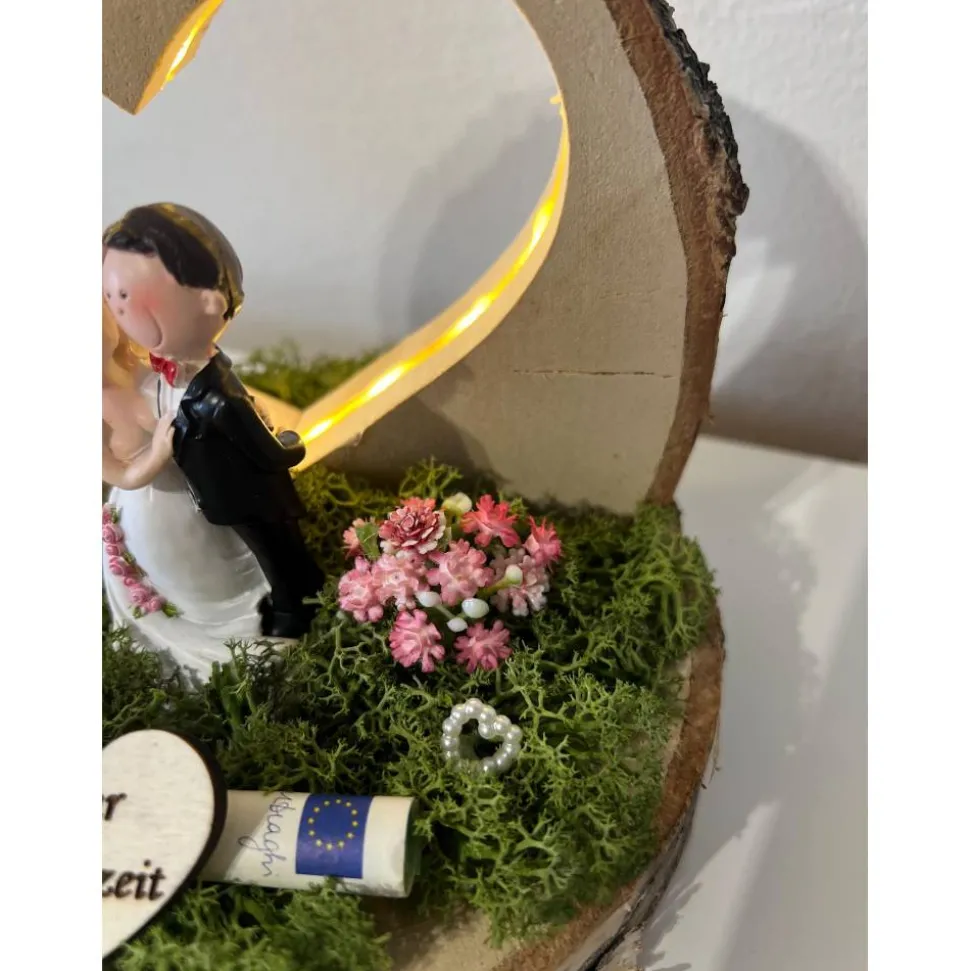 Ein schönes Hochzeitsgeschenk auf einer Baumscheibe mit einem tollen LED Herz, dass man als Geldgeschenk verschenken kann und danach als Erinnerung aufstellen kann 🙂