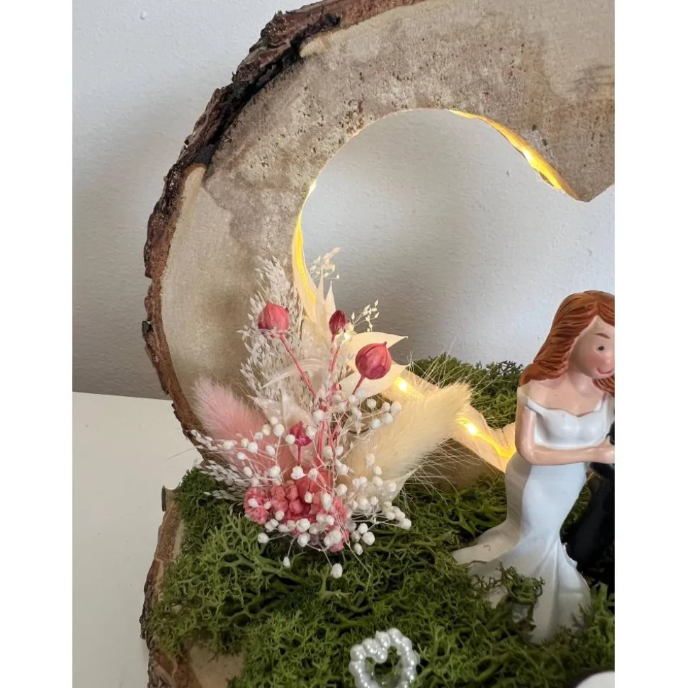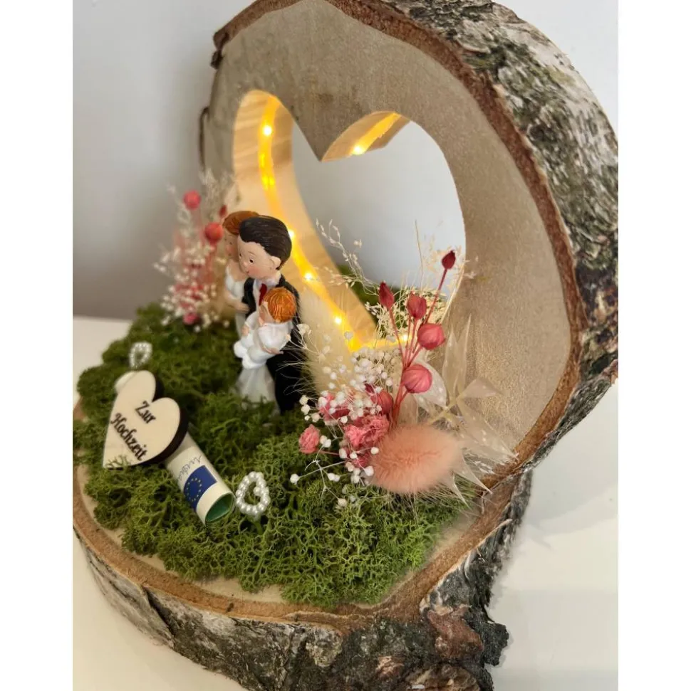 Ein schönes Hochzeitsgeschenk auf einer Baumscheibe mit einem tollen LED Herz, dass man als Geldgeschenk verschenken kann und danach als Erinnerung aufstellen kann 🙂