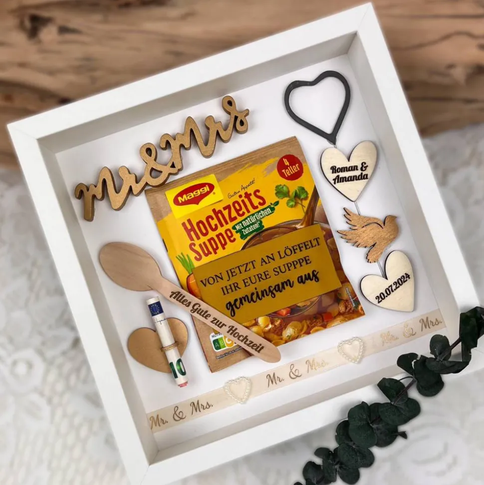 Der Hochzeitsrahmen besteht aus einer Tütensuppe, einem gravierten Holzlöffel, einem Schriftzug aus Holz, einer Wunderkerze in Herzform und gravierten Herzen mit allen Daten und einem Geldring.