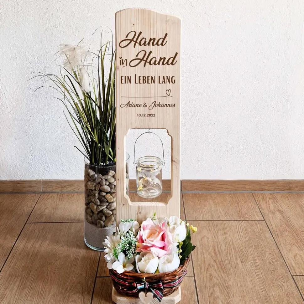 Dieser elegante Holzaufsteller mit Laterne und eingraviertem Spruch ist das ideale Geschenk, um den Tag des Brautpaares unvergesslich zu machen. Der romantische Holzschild symbolisiert den Wunsch des Brautpaares, Hand in Hand durchs Leben zu gehen. Darunter können die Namen des Paares und das Hochzeitsdatum individuell personalisiert werden. Die Laterne in der Mitte macht das Geschenk zu einem wunderschönen Blickfang, der noch lange an die magische Hochzeit erinnert wird.