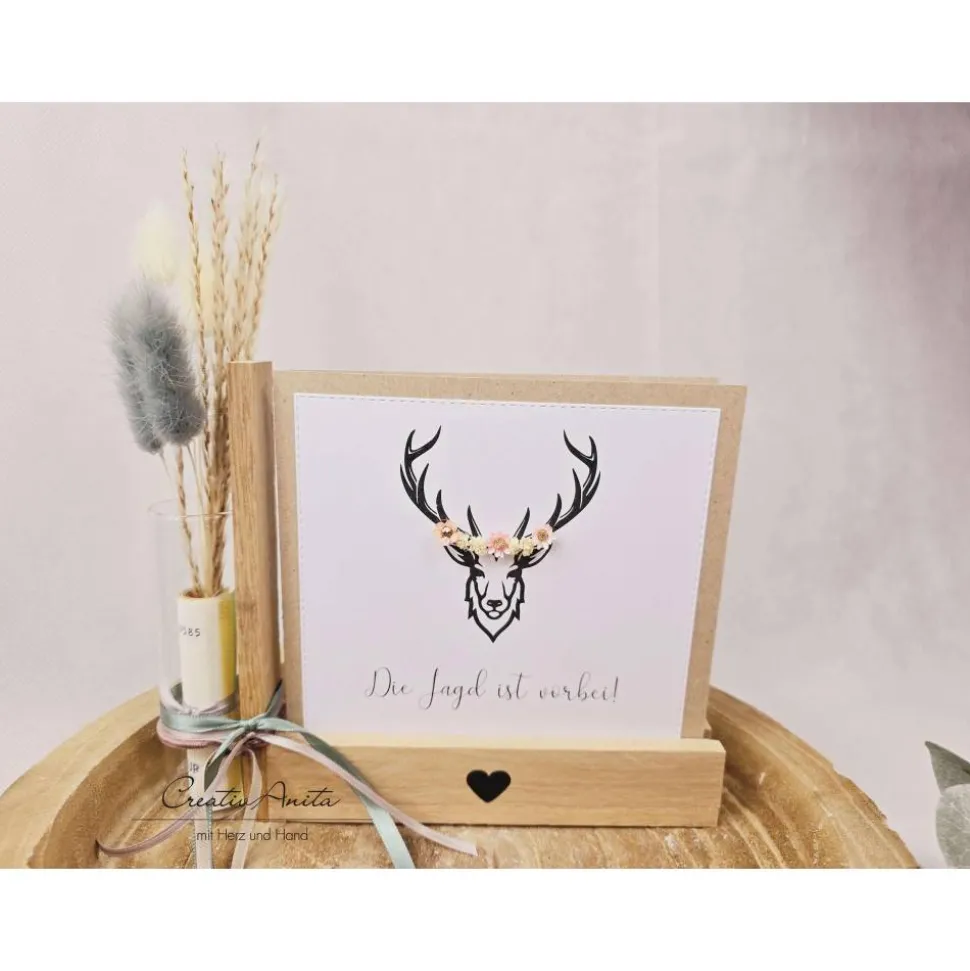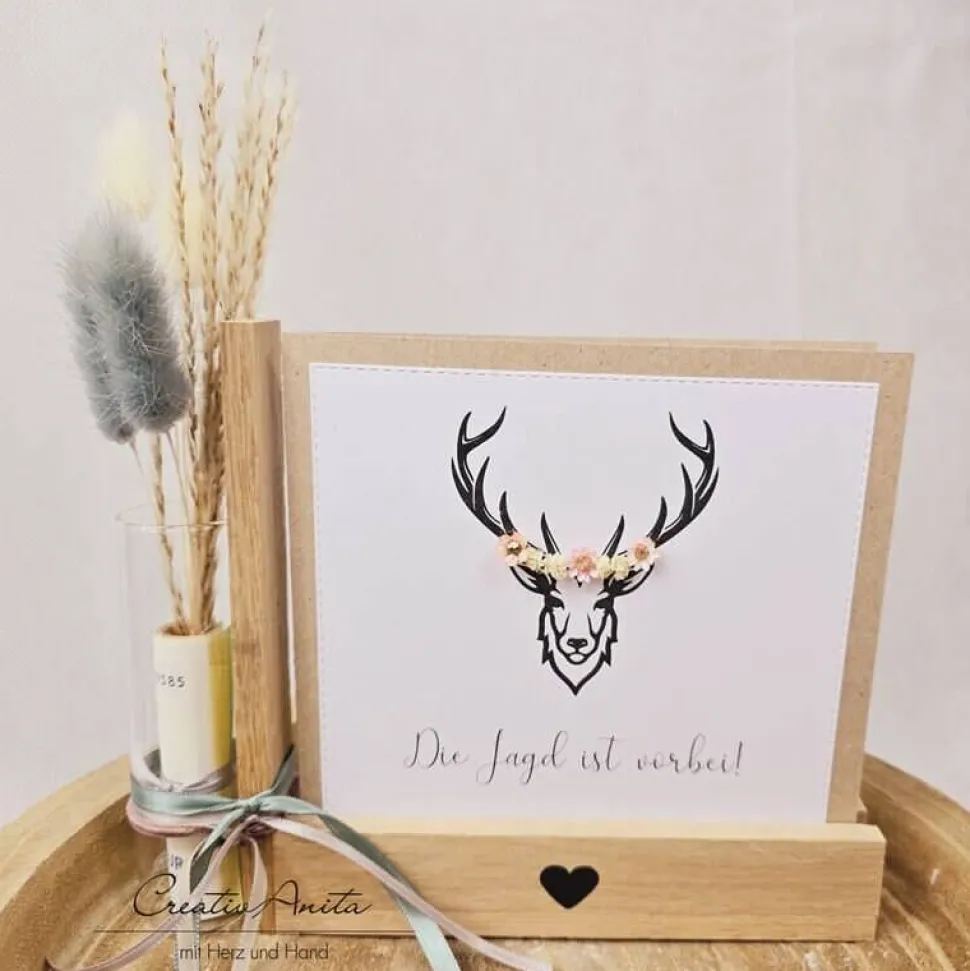 Die quadratische Karte wurde mit einem Hirschkopf bedruckt und mit Trockenblumen dekoriert.
