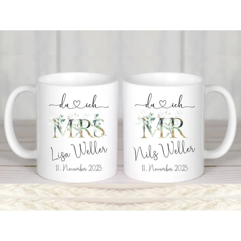 Ihr bekommt zwei Kaffeetassen die mit dem Schriftzug MR & MRS bedruckt werden.