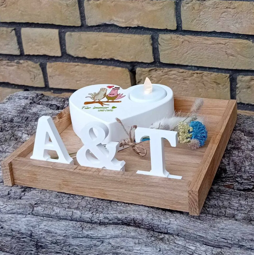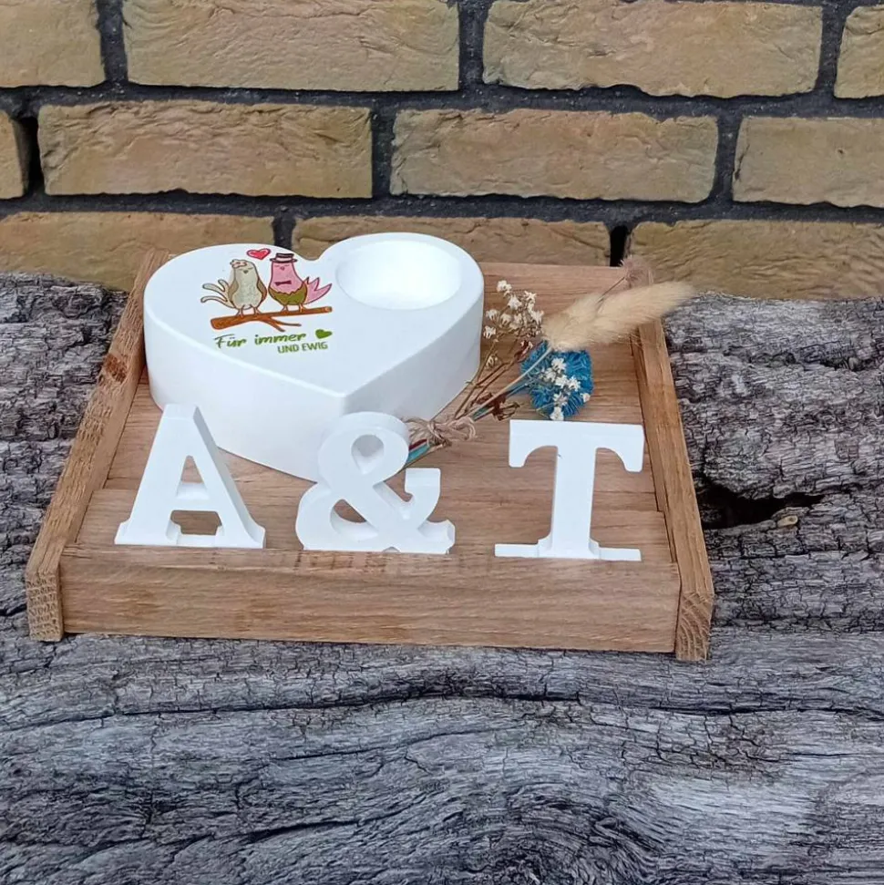 Für mein Hochzeitsgeschenk habe ich in liebevoller Handarbeit aus Raysin den herzförmigen Teelichthalter gegossen. Auf dem Teelichthalter befindet sich die Aufschrift „Für immer und ewig“ mit zwei Turteltäubchen. Zur Präsentation habe ich aus Klötzchenholz Eiche das kleine Tablett gebastelt. Ein Sträußchen Trockenblumen rundet das Ensemble ab.