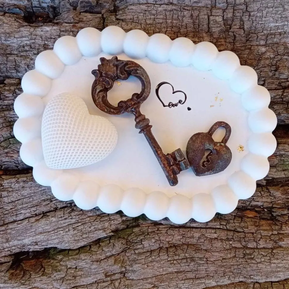 Als zusätzliche Dekoration füge ich einen Schlüssel und ein Herz aus Gips im angesagten Rost-Look sowie ein weißes geriffeltes Herz dazu.