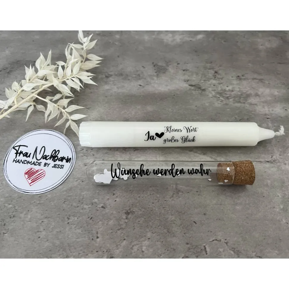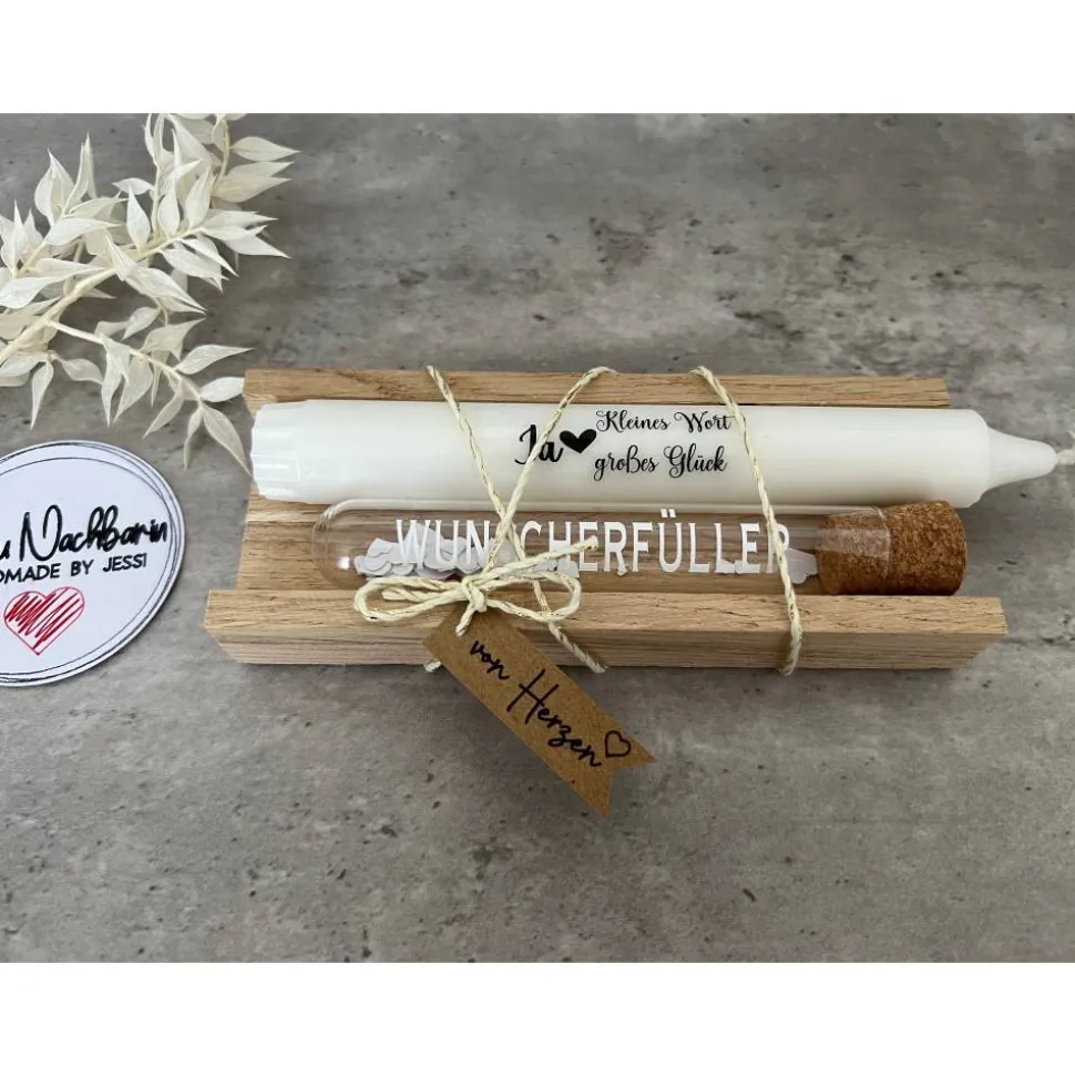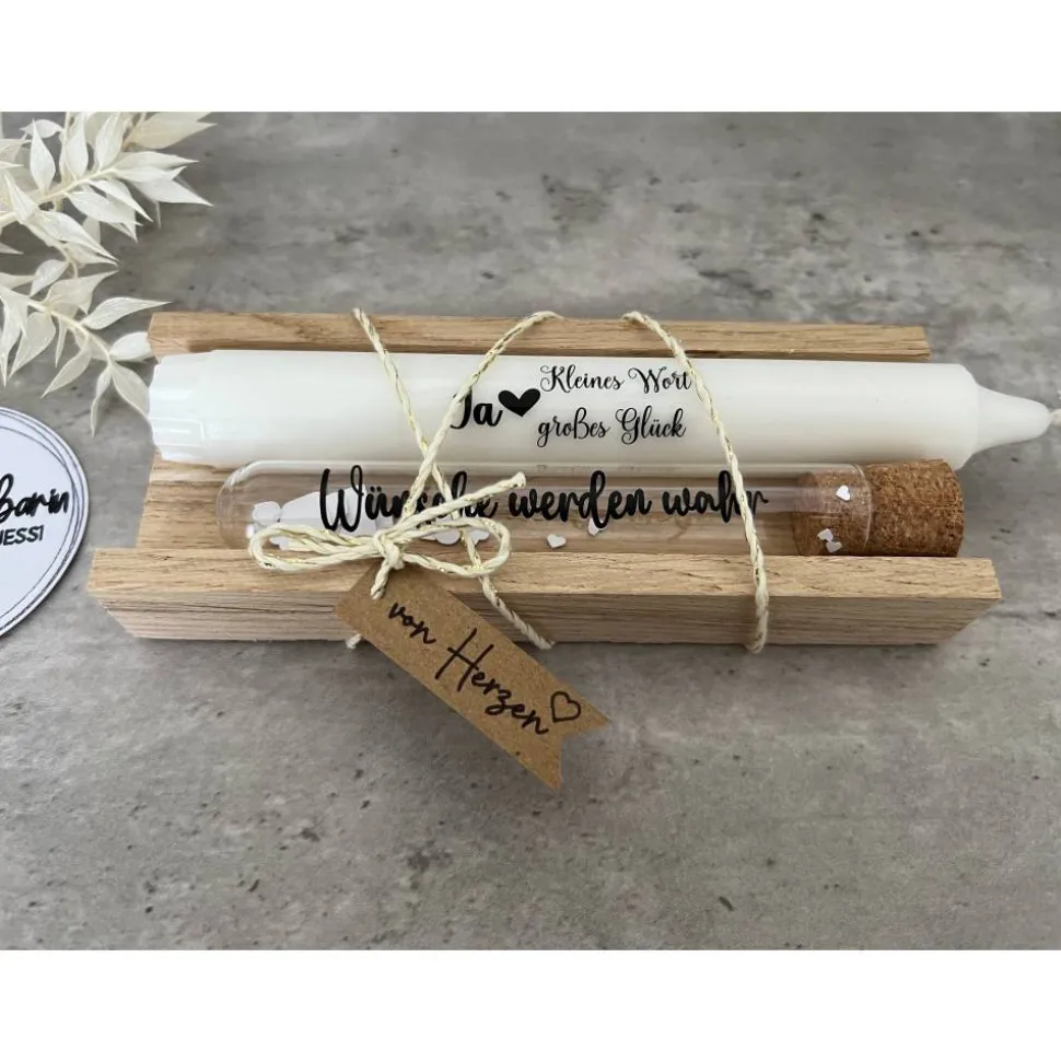 Weiße Stabkerze mit Aufdruck „Ja – kleines Wort, großes Glück“ mit Wunscherfüller inkl. liebevoll handgefertigter Holzverpackung und kleinem Schildchen