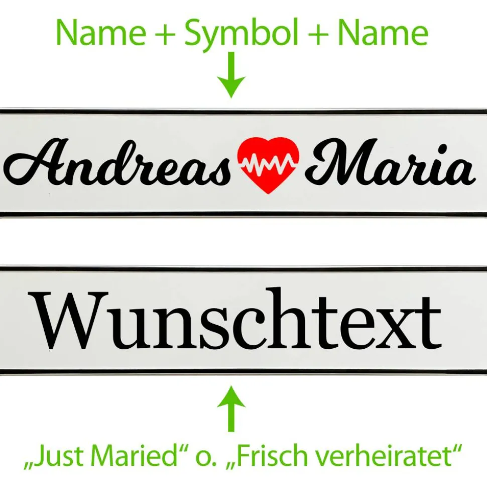 Die hochwertigen Kennzeichen sind aus Aluminium gefertigt, verfügen über abgerundete Ecken und eine schwarze Umrandung. Dank der flexiblen Maße passen sie in jede gängige Kennzeichenhalterung und lassen sich einfach montieren. Nach der Hochzeit dienen sie dir als unvergessliche Erinnerung an den schönsten Tag im Leben oder als dekoratives Highlight in deinem Zuhause.