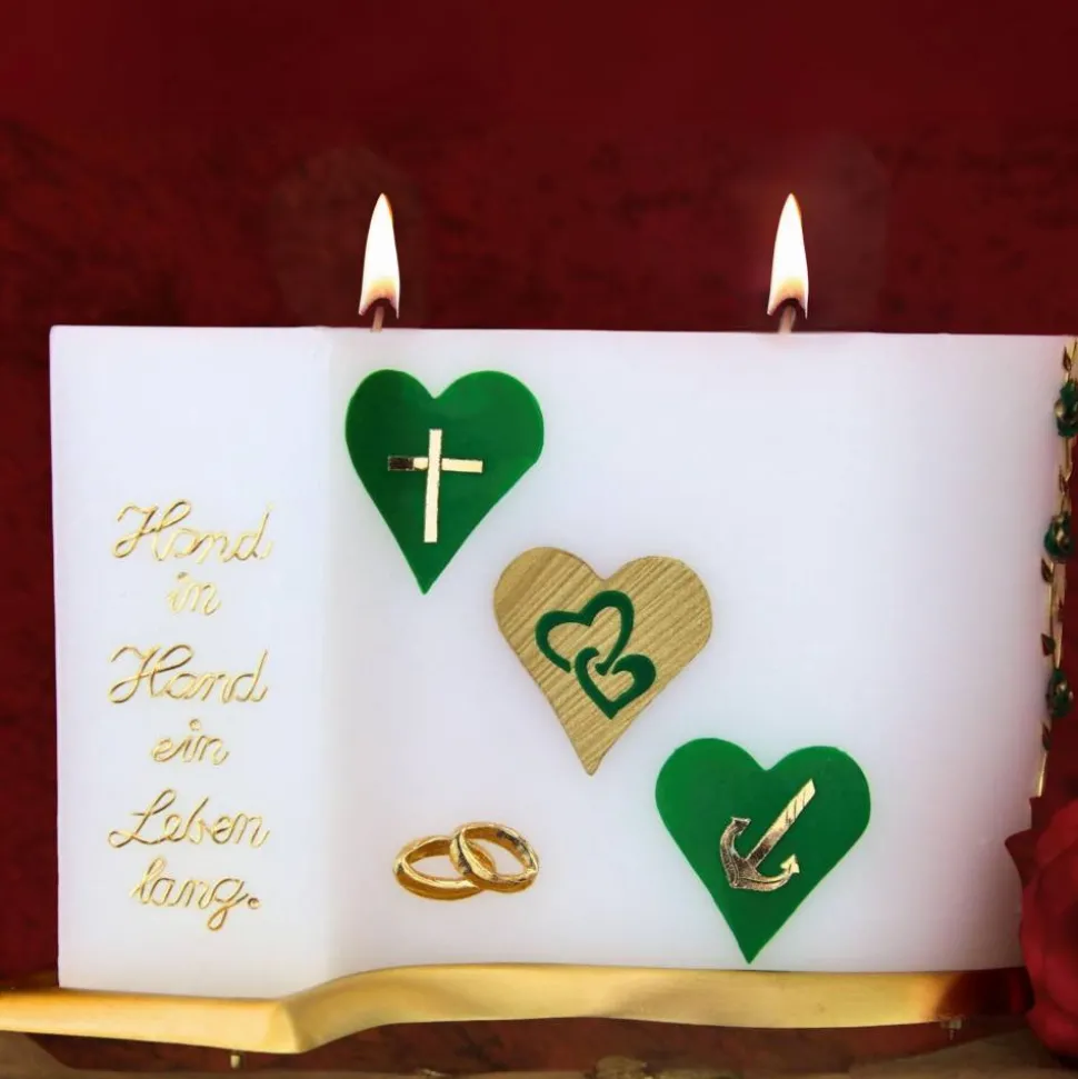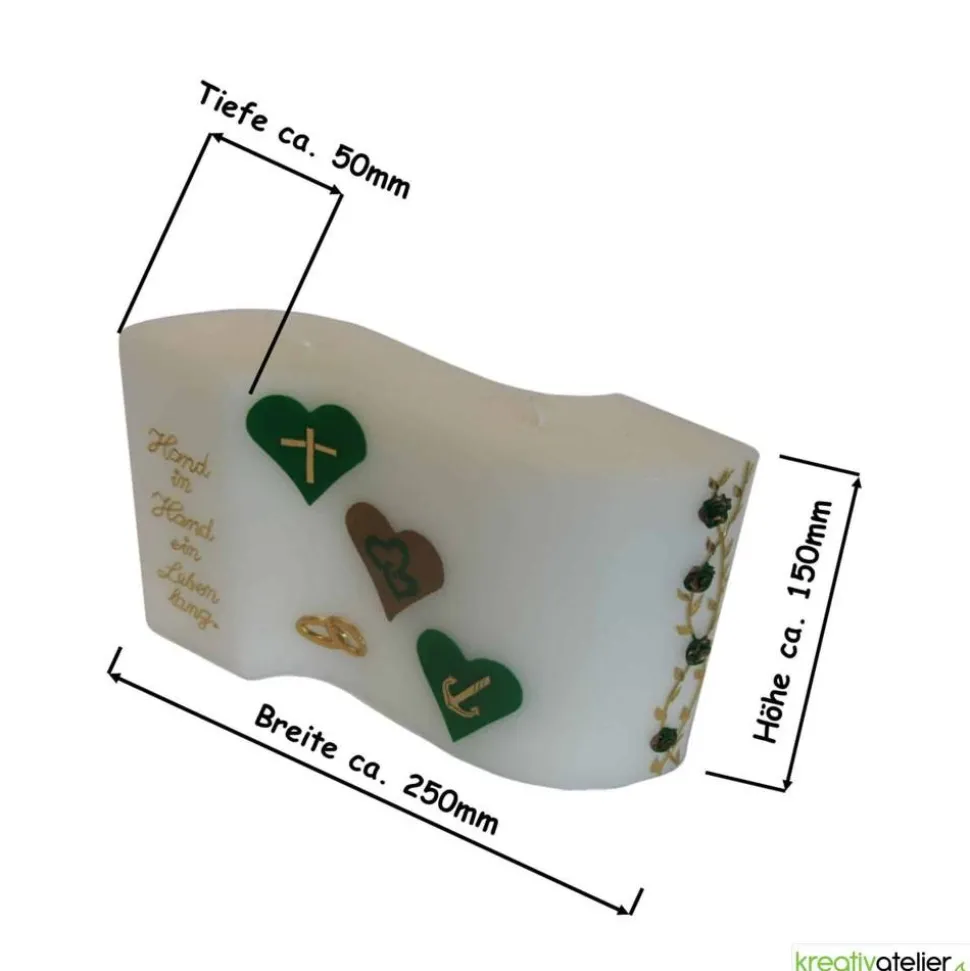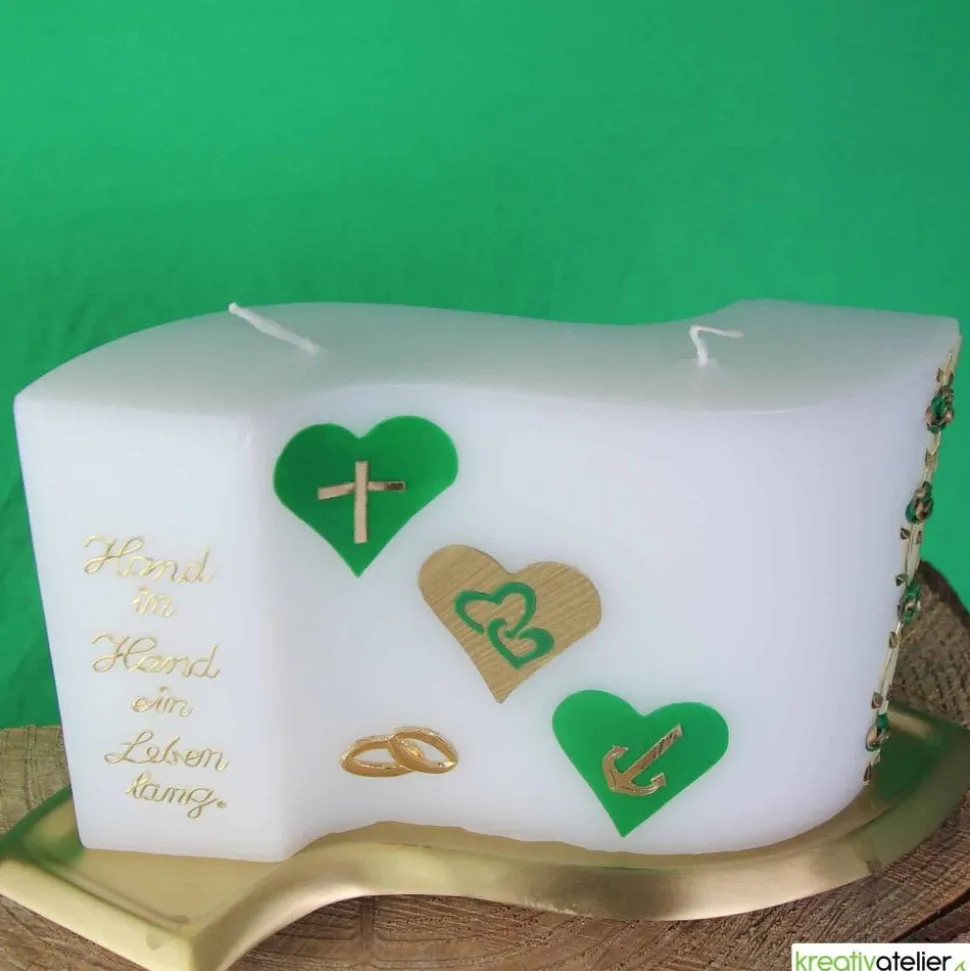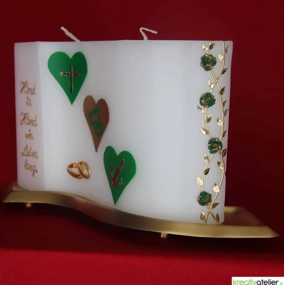 Die drei Herzen mit den Symbolen Anker, Kreuz und Herz stehen für Glaube, Liebe und Hoffnung – die Grundlagen einer glücklichen Ehe. Diese Symbole werden durch das grüne und goldene Wachs besonders hervorgehoben. Der rechte Rand der Kerze ist mit einer Ranke aus handgearbeiteten, zweifarbigen Rosen verziert, die eine romantische Atmosphäre schaffen. Unten links befinden sich zwei liegende Ringe aus goldenem Wachs als Symbol der Verbundenheit des Brautpaares.