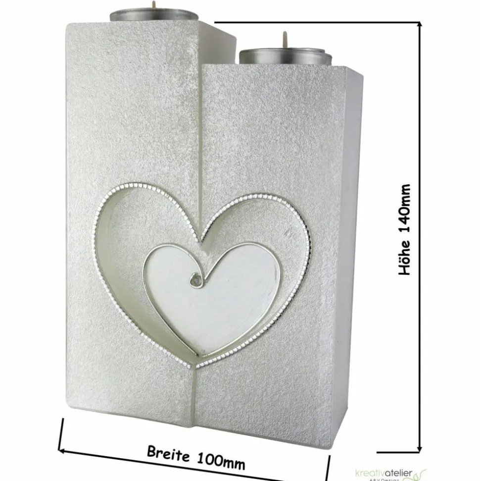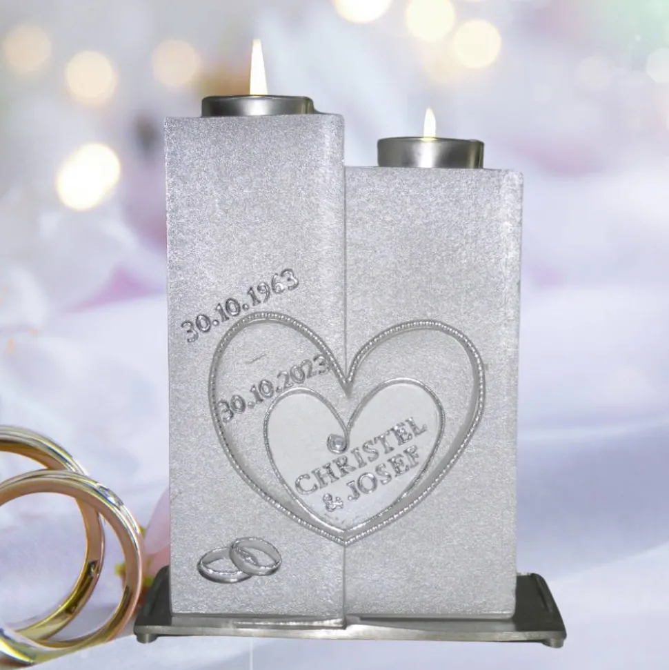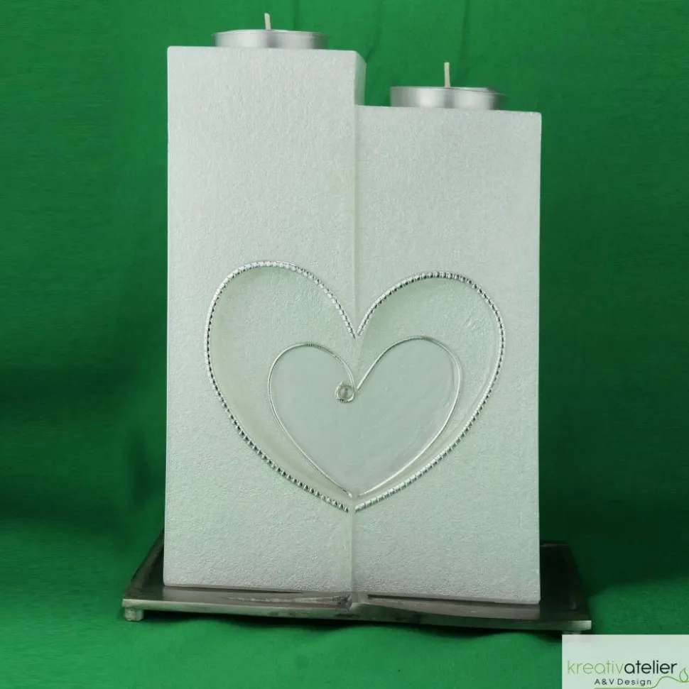 Die beiden Teelichteinsätze, geschickt eingebettet in dieses Herzstück, ermöglichen es, die Flamme der Liebe immer wieder neu zu entzünden, ohne die Kerze selbst zu verbrauchen – ein Sinnbild für die erneuerbare und ewige Leidenschaft zwischen den Ehepartnern. Diese zwei Flammen symbolisieren die Seelen des Paares, getrennt und doch vereint, die sich im gemeinsamen Leuchten finden und miteinander verschmelzen.