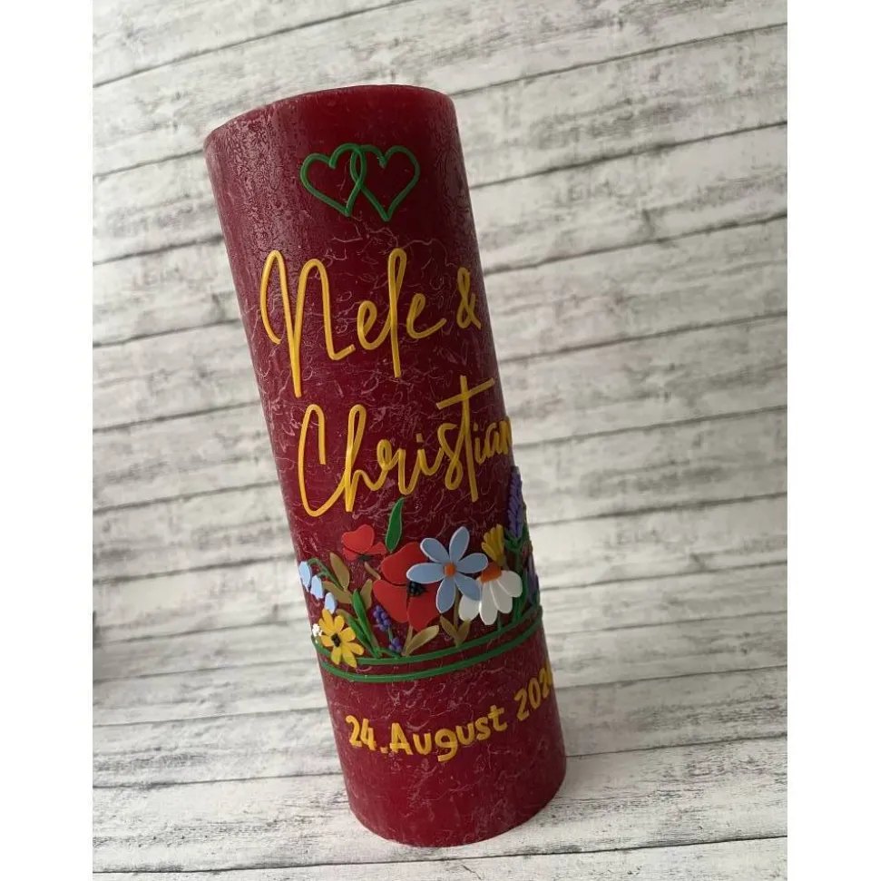 Liebevoll von Hand gestaltet, verziert mit Namen und Hochzeitsdatum.