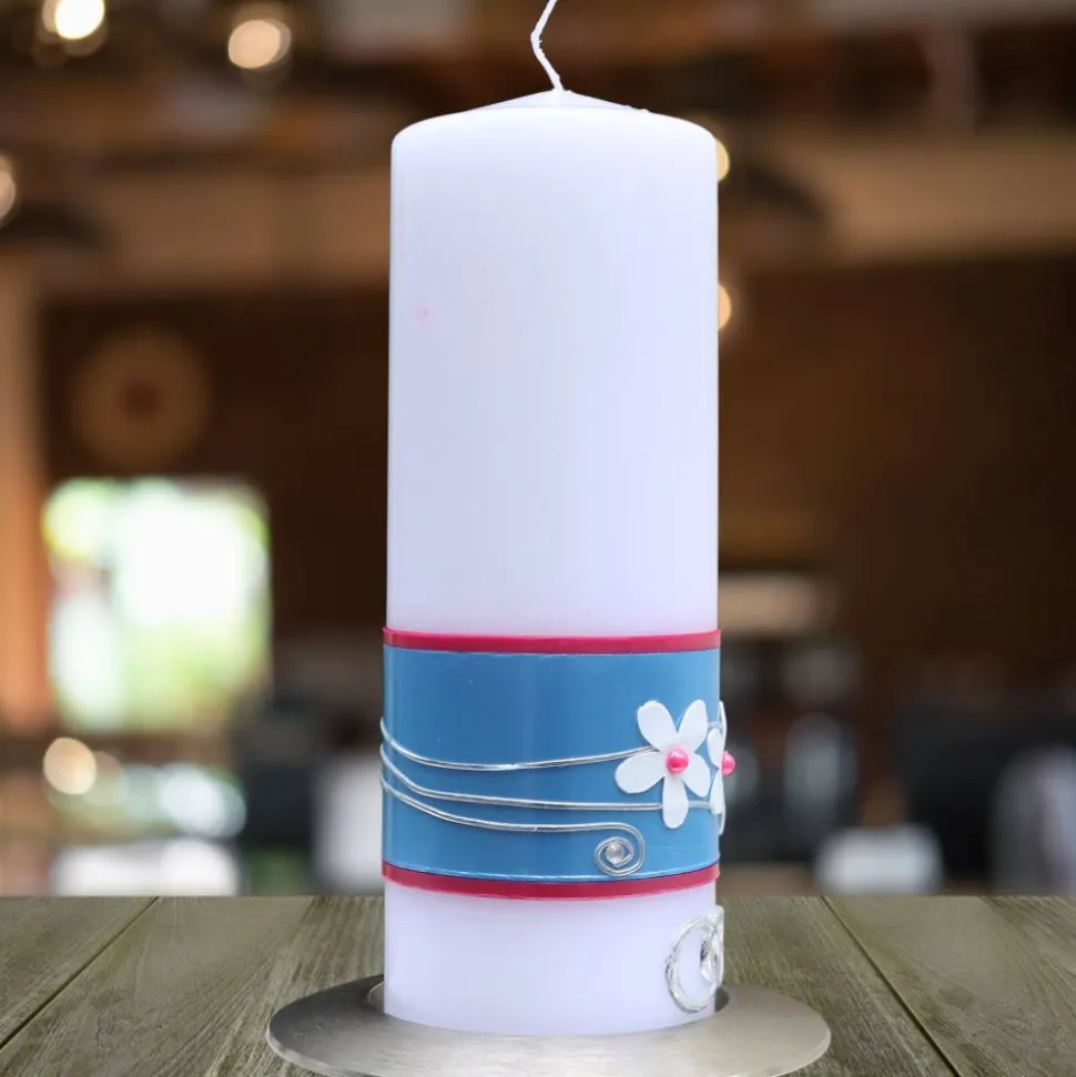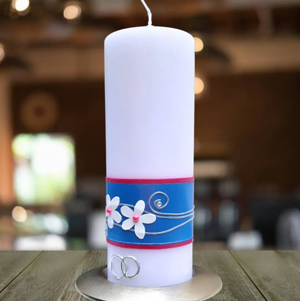 Modern, romantisch und von Hand verzierte, schlichte weiße Hochzeitskerze mit dunkelblauem Wachsstreifen im unteren Drittel, der sich ganz um die Kerze legt und von schmalen,cardinalfarbigen Wachsstreifen eingerahmt wird. Auf dieser Wachsverzierung liegen dünne, silberne Wachsstreifen auf, die ebenfalls rund um die Hochzeitskerze geführt sind und die Basis für die auf der Frontseite aufgebrachten weißen Blumen bilden.